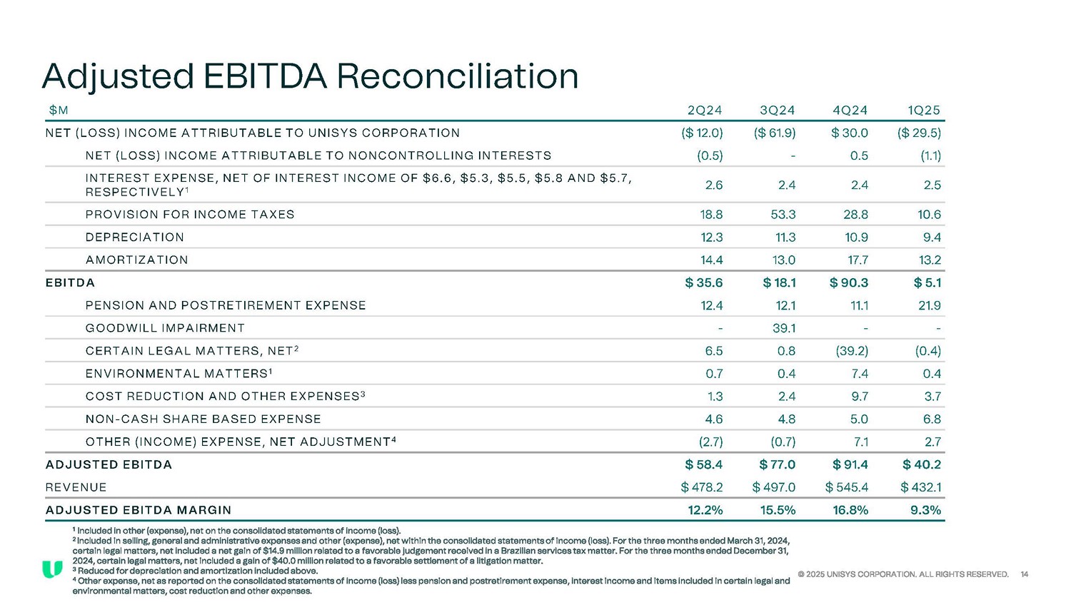 Adjusted EBITDA Reconciliation 1Q25 4Q24 3Q24 2Q24 $M ($ 29.5) $ 30.0 ($ 61.9) ($ 12.0) NET (LOSS) INCOME ATTRIBUTABLE TO UNISYS CORPORATION (1.1) 0.5 - (0.5) NET (LOSS) INCOME ATTRIBUTABLE TO NONCONTROLLING INTERESTS 2.5 2.4 2.4 2.6 INTEREST EXPENSE, NET OF INTEREST INCOME OF $6.6, $5.3, $5.5, $5 .8 AND $5.7, RESPECTIVELY 1 10.6 28.8 53.3 18.8 PROVISION FOR INCOME TAXES 9.4 10.9 11.3 12.3 DEPRECIATION 13.2 17.7 13.0 14.4 AMORTIZATION $ 5.1 $ 90.3 $ 18.1 $ 35.6 EBITDA 21.9 11.1 12.1 12.4 PENSION AND POSTRETIREMENT EXPENSE - - 39.1 - GOODWILL IMPAIRMENT (0.4) (39.2) 0.8 6.5 CERTAIN LEGAL MATTERS, NET 2 0.4 7.4 0.4 0.7 ENVIRONMENTAL MATTERS 1 3.7 9.7 2.4 1.3 COST REDUCTION AND OTHER EXPENSES 3 6.8 5.0 4.8 4.6 NON - CASH SHARE BASED EXPENSE 2.7 7.1 (0.7) (2.7) OTHER (INCOME) EXPENSE, NET ADJUSTMENT 4 $ 40.2 $ 91.4 $ 77.0 $ 58.4 ADJUSTED EBITDA $ 432.1 $ 545.4 $ 497.0 $ 478.2 REVENUE 9.3% 16.8% 15.5% 12.2% ADJUSTED EBITDA MARGIN