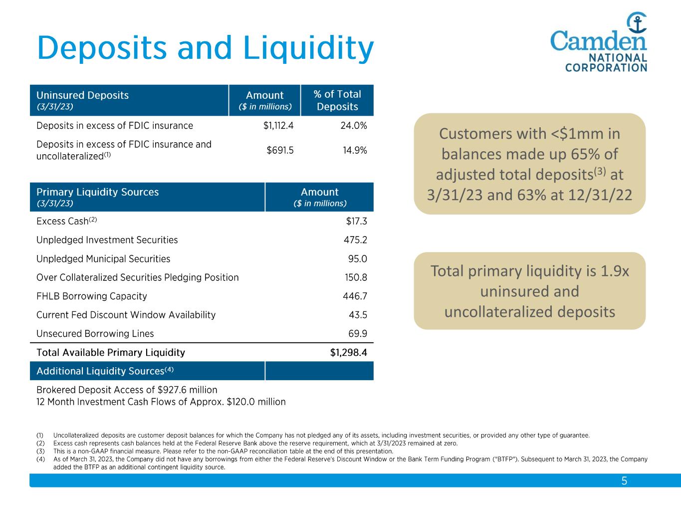 Total primary liquidity is 1.9x uninsured and uncollateralized deposits Customers with <$1mm in balances made up 65% of adjusted total deposits(3) at 3/31/23 and 63% at 12/31/22