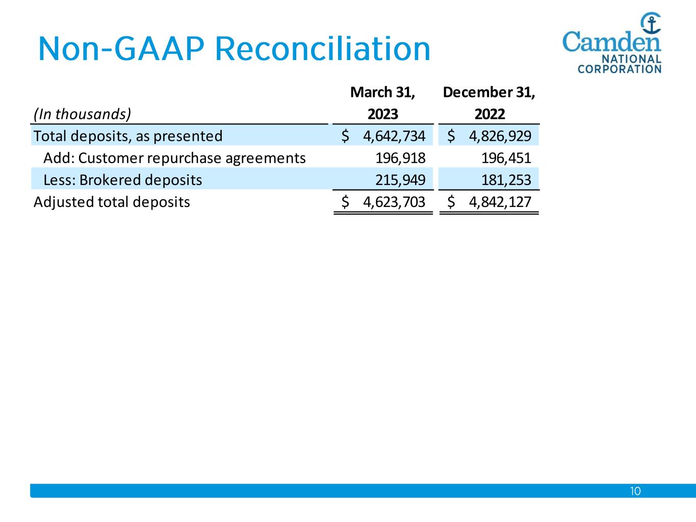 (In thousands) March 31, 2023 December 31, 2022 Total deposits, as presented 4,642,734$ 4,826,929$ Add: Customer repurchase agreements 196,918 196,451 Less: Brokered deposits 215,949 181,253 Adjusted total deposits 4,623,703$ 4,842,127$