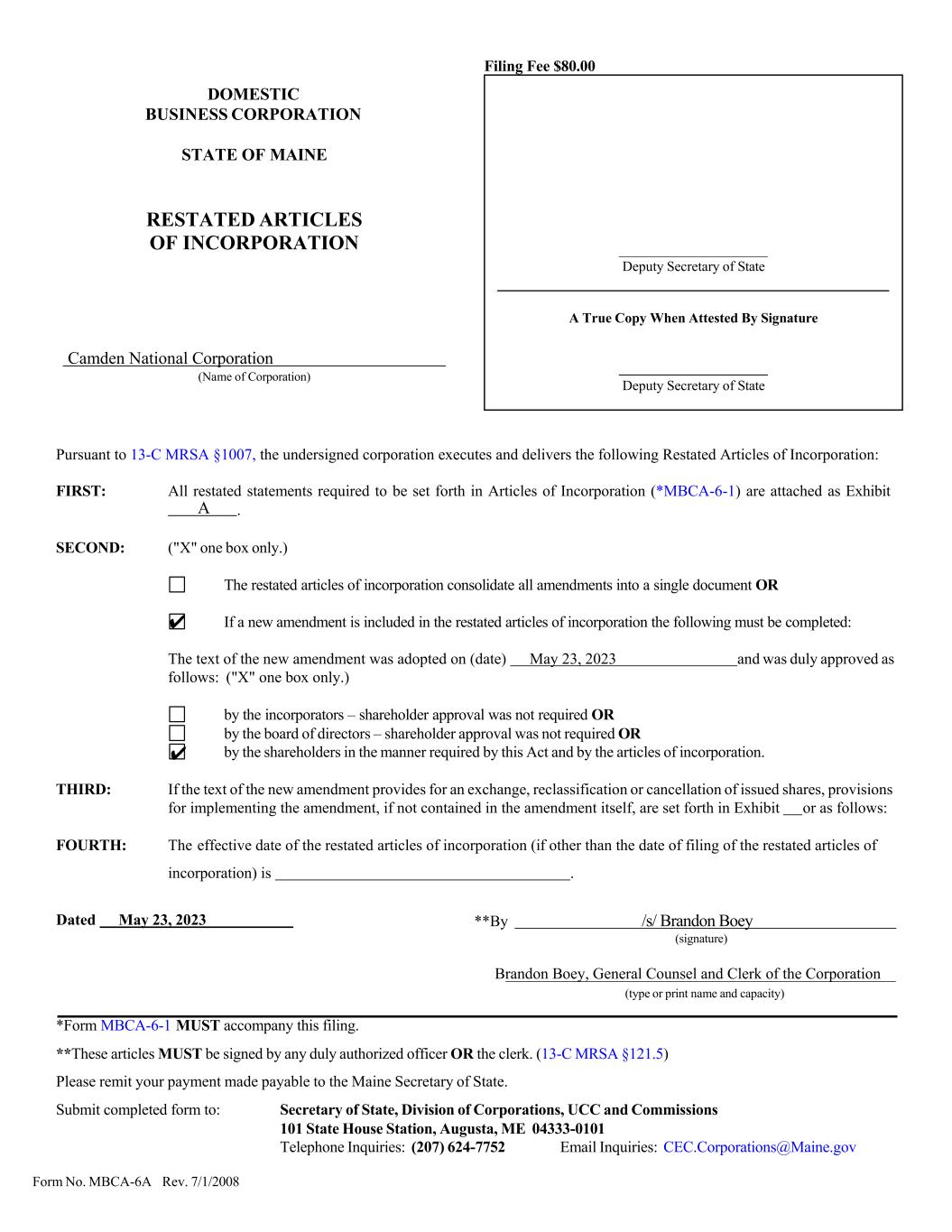 Deputy Secretary of State A True Copy When Attested By Signature Deputy Secretary of State Filing Fee $80.00 DOMESTIC BUSINESS CORPORATION STATE OF MAINE RESTATED ARTICLES OF INCORPORATION Camden National Corporation (Name of Corporation) Pursuant to 13-C MRSA §1007, the undersigned corporation executes and delivers the following Restated Articles of Incorporation: FIRST: All restated statements required to be set forth in Articles of Incorporation (*MBCA-6-1) are attached as Exhibit A . SECOND: ("X" one box only.) The restated articles of incorporation consolidate all amendments into a single document OR If a new amendment is included in the restated articles of incorporation the following must be completed: The text of the new amendment was adopted on (date) May 23, 2023 and was duly approved as follows: ("X" one box only.) by the incorporators – shareholder approval was not required OR by the board of directors – shareholder approval was not required OR by the shareholders in the manner required by this Act and by the articles of incorporation. THIRD: If the text of the new amendment provides for an exchange, reclassification or cancellation of issued shares, provisions for implementing the amendment, if not contained in the amendment itself, are set forth in Exhibit or as follows: FOURTH: The effective date of the restated articles of incorporation (if other than the date of filing of the restated articles of incorporation) is . Dated May 23, 2023 **By /s/ Brandon Boey (signature) Brandon Boey, General Counsel and Clerk of the Corporation *Form MBCA-6-1 MUST accompany this filing. (type or print name and capacity) **These articles MUST be signed by any duly authorized officer OR the clerk. (13-C MRSA §121.5) Please remit your payment made payable to the Maine Secretary of State. Submit completed form to: Secretary of State, Division of Corporations, UCC and Commissions 101 State House Station, Augusta, ME 04333-0101 Telephone Inquiries: (207) 624-7752 Email Inquiries: CEC.Corporations@Maine.gov Form No. MBCA-6A Rev. 7/1/2008 ✔ ✔