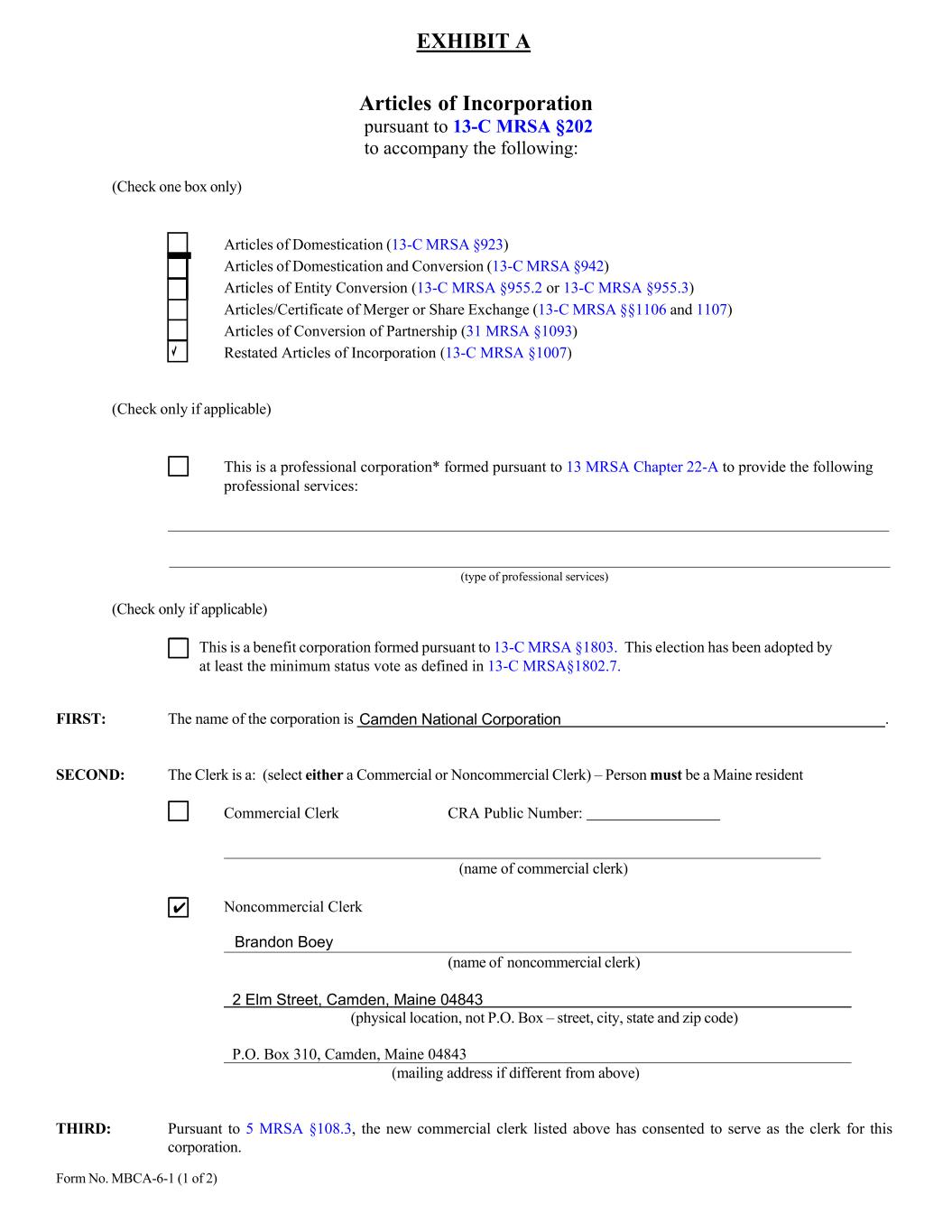 Form No. MBCA-6-1 (1 of 2) EXHIBIT A Articles of Incorporation pursuant to 13-C MRSA §202 to accompany the following: (Check one box only) Articles of Domestication (13-C MRSA §923) Articles of Domestication and Conversion (13-C MRSA §942) Articles of Entity Conversion (13-C MRSA §955.2 or 13-C MRSA §955.3) Articles/Certificate of Merger or Share Exchange (13-C MRSA §§1106 and 1107) Articles of Conversion of Partnership (31 MRSA §1093) Restated Articles of Incorporation (13-C MRSA §1007) (Check only if applicable) This is a professional corporation* formed pursuant to 13 MRSA Chapter 22-A to provide the following professional services: (Check only if applicable) (type of professional services) This is a benefit corporation formed pursuant to 13-C MRSA §1803. This election has been adopted by at least the minimum status vote as defined in 13-C MRSA§1802.7. FIRST: The name of the corporation is Camden National Corporation . SECOND: The Clerk is a: (select either a Commercial or Noncommercial Clerk) – Person must be a Maine resident Commercial Clerk CRA Public Number: (name of commercial clerk) Noncommercial Clerk Brandon Boey (name of noncommercial clerk) 2 Elm Street, Camden, Maine 04843 (physical location, not P.O. Box – street, city, state and zip code) P.O. Box 310, Camden, Maine 04843 (mailing address if different from above) THIRD: Pursuant to 5 MRSA §108.3, the new commercial clerk listed above has consented to serve as the clerk for this corporation. ✔ ✔