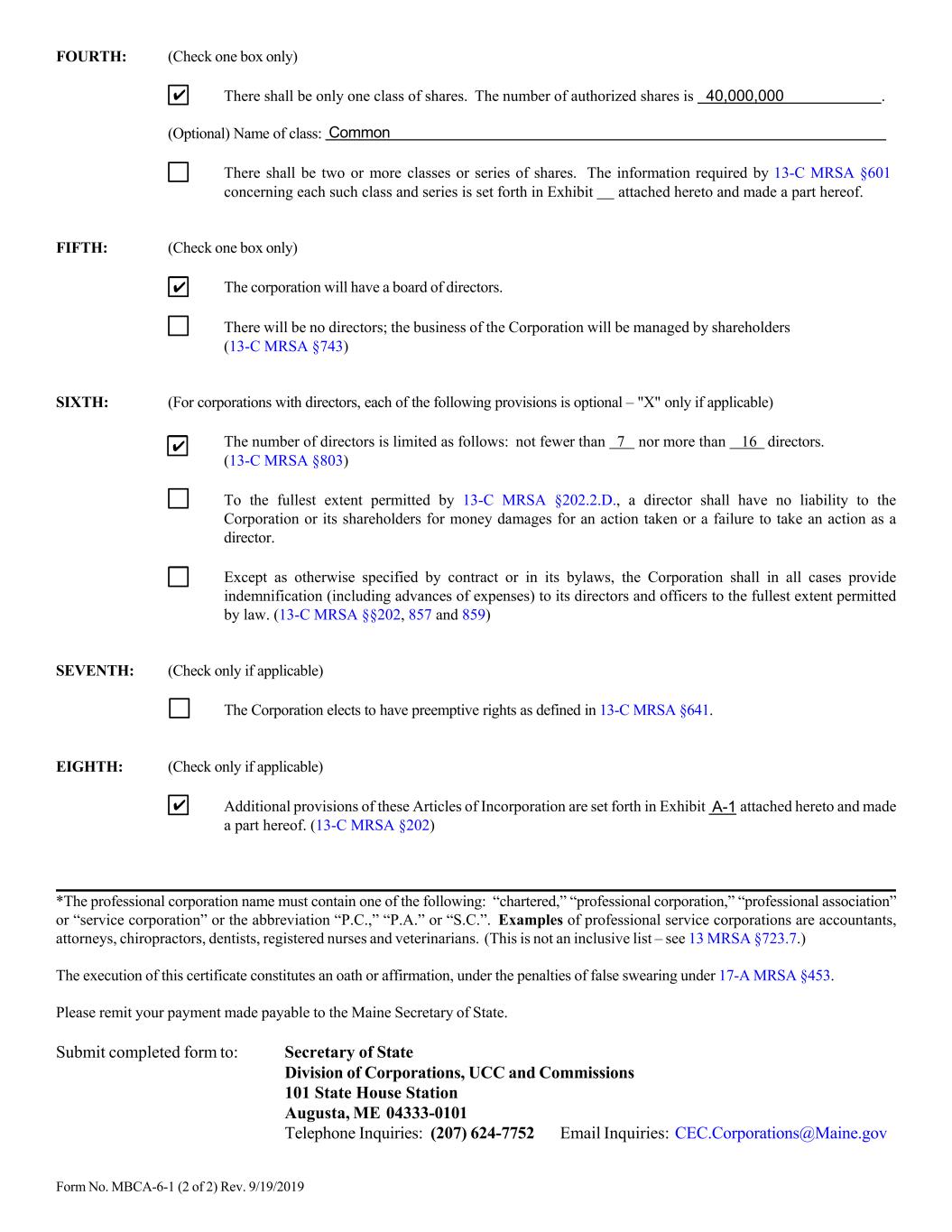 Form No. MBCA-6-1 (2 of 2) Rev. 9/19/2019 ✔ FOURTH: (Check one box only) There shall be only one class of shares. The number of authorized shares is 40,000,000 . (Optional) Name of class: Common There shall be two or more classes or series of shares. The information required by 13-C MRSA §601 concerning each such class and series is set forth in Exhibit attached hereto and made a part hereof. FIFTH: (Check one box only) The corporation will have a board of directors. There will be no directors; the business of the Corporation will be managed by shareholders (13-C MRSA §743) SIXTH: (For corporations with directors, each of the following provisions is optional – "X" only if applicable) The number of directors is limited as follows: not fewer than 7 nor more than 16 directors. (13-C MRSA §803) To the fullest extent permitted by 13-C MRSA §202.2.D., a director shall have no liability to the Corporation or its shareholders for money damages for an action taken or a failure to take an action as a director. Except as otherwise specified by contract or in its bylaws, the Corporation shall in all cases provide indemnification (including advances of expenses) to its directors and officers to the fullest extent permitted by law. (13-C MRSA §§202, 857 and 859) SEVENTH: (Check only if applicable) The Corporation elects to have preemptive rights as defined in 13-C MRSA §641. EIGHTH: (Check only if applicable) Additional provisions of these Articles of Incorporation are set forth in Exhibit A-1 attached hereto and made a part hereof. (13-C MRSA §202) *The professional corporation name must contain one of the following: “chartered,” “professional corporation,” “professional association” or “service corporation” or the abbreviation “P.C.,” “P.A.” or “S.C.”. Examples of professional service corporations are accountants, attorneys, chiropractors, dentists, registered nurses and veterinarians. (This is not an inclusive list – see 13 MRSA §723.7.) The execution of this certificate constitutes an oath or affirmation, under the penalties of false swearing under 17-A MRSA §453. Please remit your payment made payable to the Maine Secretary of State. Submit completed form to: Secretary of State Division of Corporations, UCC and Commissions 101 State House Station Augusta, ME 04333-0101 Telephone Inquiries: (207) 624-7752 Email Inquiries: CEC.Corporations@Maine.gov ✔ ✔ ✔