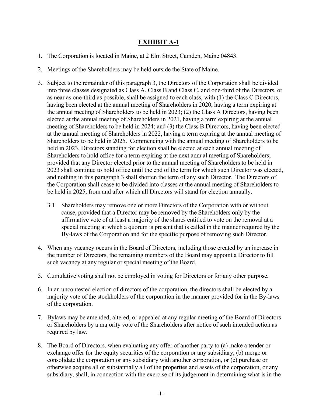 -1- EXHIBIT A-1 1. The Corporation is located in Maine, at 2 Elm Street, Camden, Maine 04843. 2. Meetings of the Shareholders may be held outside the State of Maine. 3. Subject to the remainder of this paragraph 3, the Directors of the Corporation shall be divided into three classes designated as Class A, Class B and Class C, and one-third of the Directors, or as near as one-third as possible, shall be assigned to each class, with (1) the Class C Directors, having been elected at the annual meeting of Shareholders in 2020, having a term expiring at the annual meeting of Shareholders to be held in 2023; (2) the Class A Directors, having been elected at the annual meeting of Shareholders in 2021, having a term expiring at the annual meeting of Shareholders to be held in 2024; and (3) the Class B Directors, having been elected at the annual meeting of Shareholders in 2022, having a term expiring at the annual meeting of Shareholders to be held in 2025. Commencing with the annual meeting of Shareholders to be held in 2023, Directors standing for election shall be elected at each annual meeting of Shareholders to hold office for a term expiring at the next annual meeting of Shareholders; provided that any Director elected prior to the annual meeting of Shareholders to be held in 2023 shall continue to hold office until the end of the term for which such Director was elected, and nothing in this paragraph 3 shall shorten the term of any such Director. The Directors of the Corporation shall cease to be divided into classes at the annual meeting of Shareholders to be held in 2025, from and after which all Directors will stand for election annually. 3.1 Shareholders may remove one or more Directors of the Corporation with or without cause, provided that a Director may be removed by the Shareholders only by the affirmative vote of at least a majority of the shares entitled to vote on the removal at a special meeting at which a quorum is present that is called in the manner required by the By-laws of the Corporation and for the specific purpose of removing such Director. 4. When any vacancy occurs in the Board of Directors, including those created by an increase in the number of Directors, the remaining members of the Board may appoint a Director to fill such vacancy at any regular or special meeting of the Board. 5. Cumulative voting shall not be employed in voting for Directors or for any other purpose. 6. In an uncontested election of directors of the corporation, the directors shall be elected by a majority vote of the stockholders of the corporation in the manner provided for in the By-laws of the corporation. 7. Bylaws may be amended, altered, or appealed at any regular meeting of the Board of Directors or Shareholders by a majority vote of the Shareholders after notice of such intended action as required by law. 8. The Board of Directors, when evaluating any offer of another party to (a) make a tender or exchange offer for the equity securities of the corporation or any subsidiary, (b) merge or consolidate the corporation or any subsidiary with another corporation, or (c) purchase or otherwise acquire all or substantially all of the properties and assets of the corporation, or any subsidiary, shall, in connection with the exercise of its judgement in determining what is in the