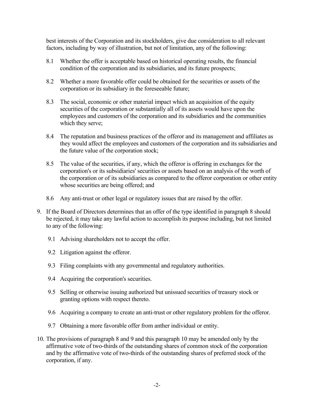 -2- best interests of the Corporation and its stockholders, give due consideration to all relevant factors, including by way of illustration, but not of limitation, any of the following: 8.1 Whether the offer is acceptable based on historical operating results, the financial condition of the corporation and its subsidiaries, and its future prospects; 8.2 Whether a more favorable offer could be obtained for the securities or assets of the corporation or its subsidiary in the foreseeable future; 8.3 The social, economic or other material impact which an acquisition of the equity securities of the corporation or substantially all of its assets would have upon the employees and customers of the corporation and its subsidiaries and the communities which they serve; 8.4 The reputation and business practices of the offeror and its management and affiliates as they would affect the employees and customers of the corporation and its subsidiaries and the future value of the corporation stock; 8.5 The value of the securities, if any, which the offeror is offering in exchanges for the corporation's or its subsidiaries' securities or assets based on an analysis of the worth of the corporation or of its subsidiaries as compared to the offeror corporation or other entity whose securities are being offered; and 8.6 Any anti-trust or other legal or regulatory issues that are raised by the offer. 9. If the Board of Directors determines that an offer of the type identified in paragraph 8 should be rejected, it may take any lawful action to accomplish its purpose including, but not limited to any of the following: 9.1 Advising shareholders not to accept the offer. 9.2 Litigation against the offeror. 9.3 Filing complaints with any governmental and regulatory authorities. 9.4 Acquiring the corporation's securities. 9.5 Selling or otherwise issuing authorized but unissued securities of treasury stock or granting options with respect thereto. 9.6 Acquiring a company to create an anti-trust or other regulatory problem for the offeror. 9.7 Obtaining a more favorable offer from anther individual or entity. 10. The provisions of paragraph 8 and 9 and this paragraph 10 may be amended only by the affirmative vote of two-thirds of the outstanding shares of common stock of the corporation and by the affirmative vote of two-thirds of the outstanding shares of preferred stock of the corporation, if any.