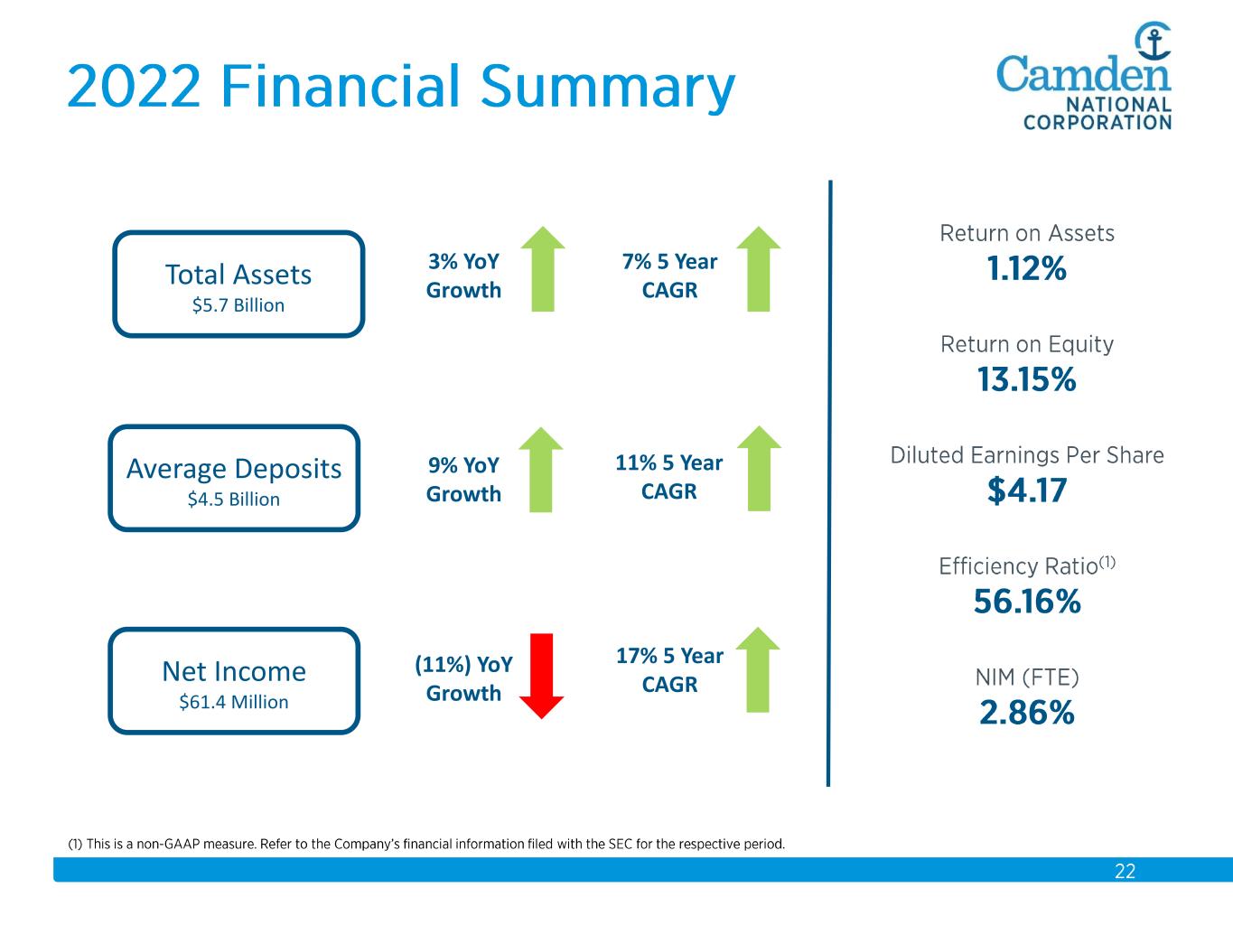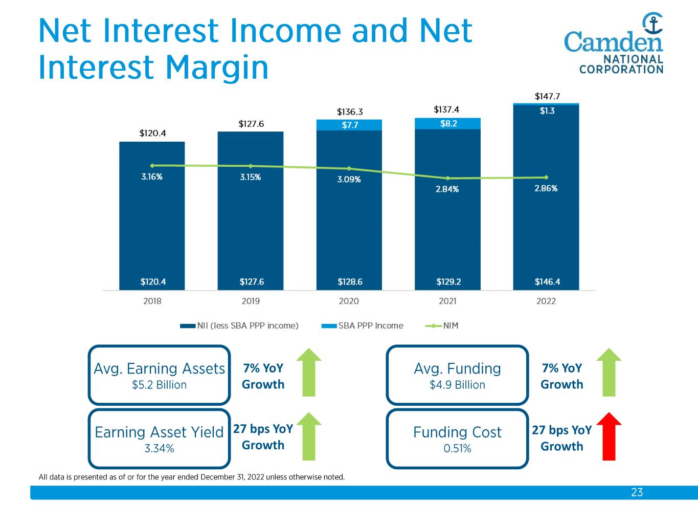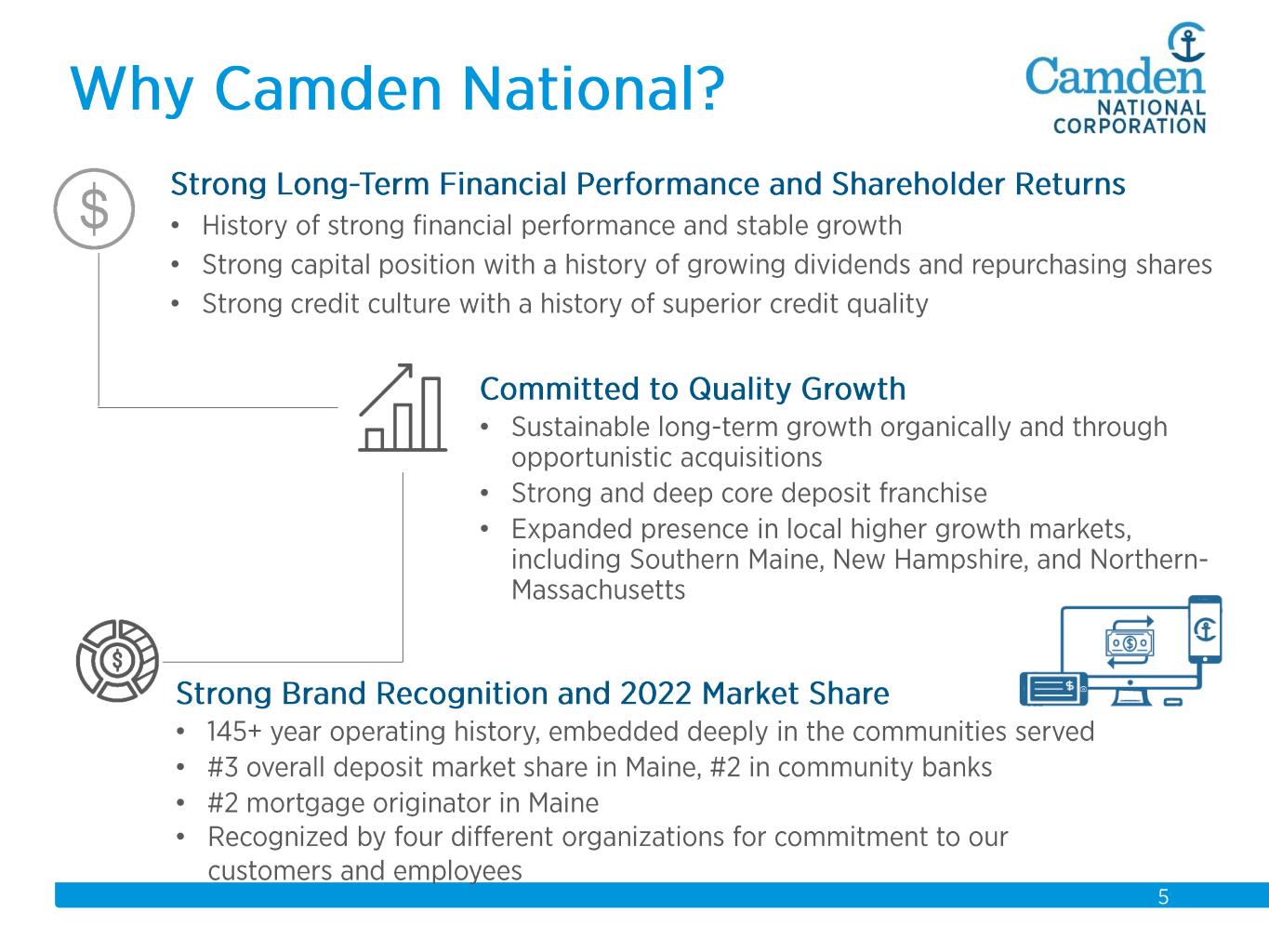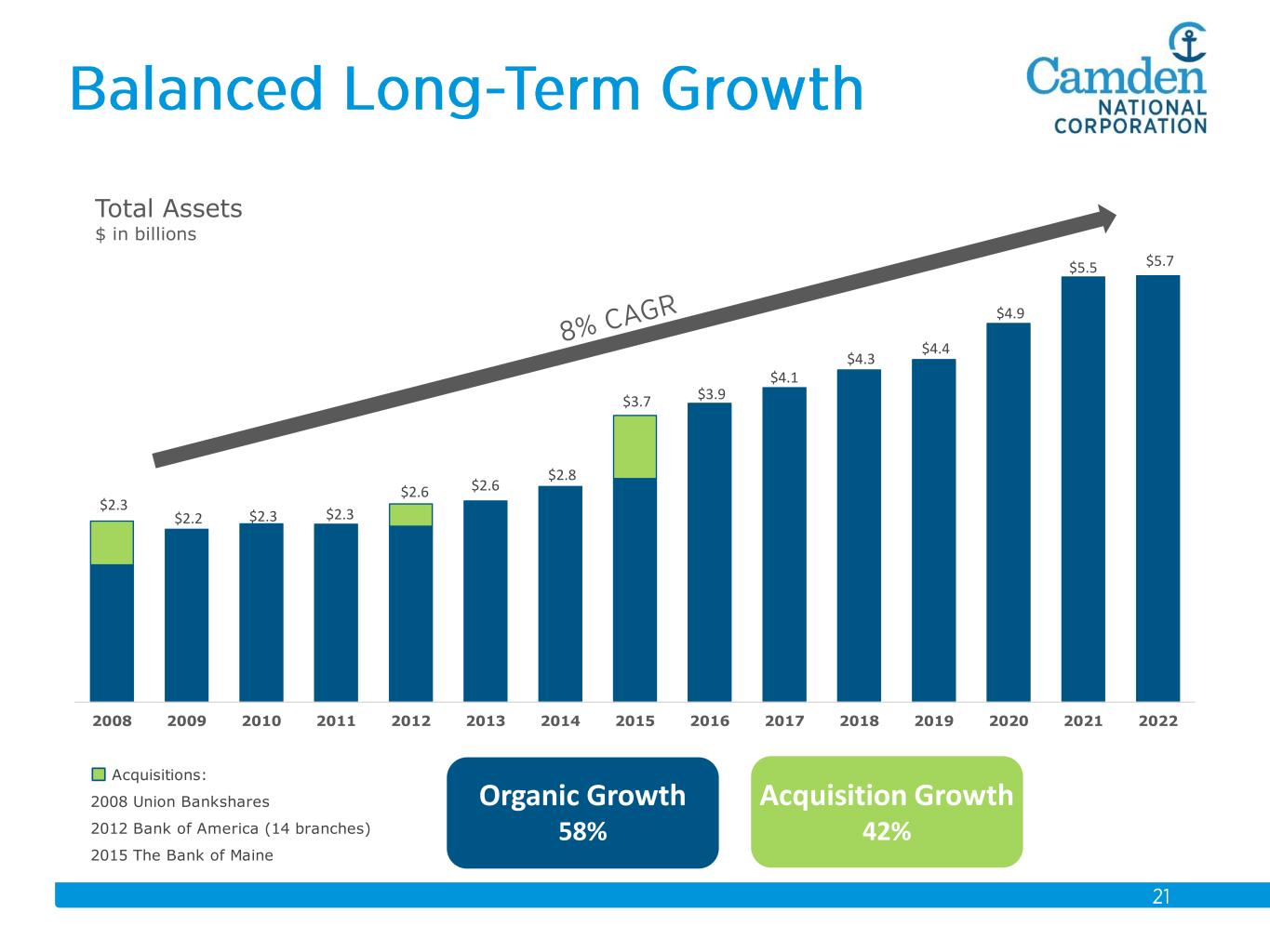 $2.3 $2.2 $2.3 $2.3 $2.6 $2.6 $2.8 $3.7 $3.9 $4.1 $4.3 $4.4 $4.9 $5.5 $5.7 2008 2009 2010 2011 2012 2013 2014 2015 2016 2017 2018 2019 2020 2021 2022 Total Assets $ in billions Acquisitions: 2008 Union Bankshares 2012 Bank of America (14 branches) 2015 The Bank of Maine Organic Growth 58% Acquisition Growth 42%