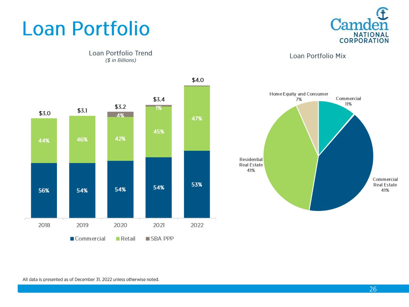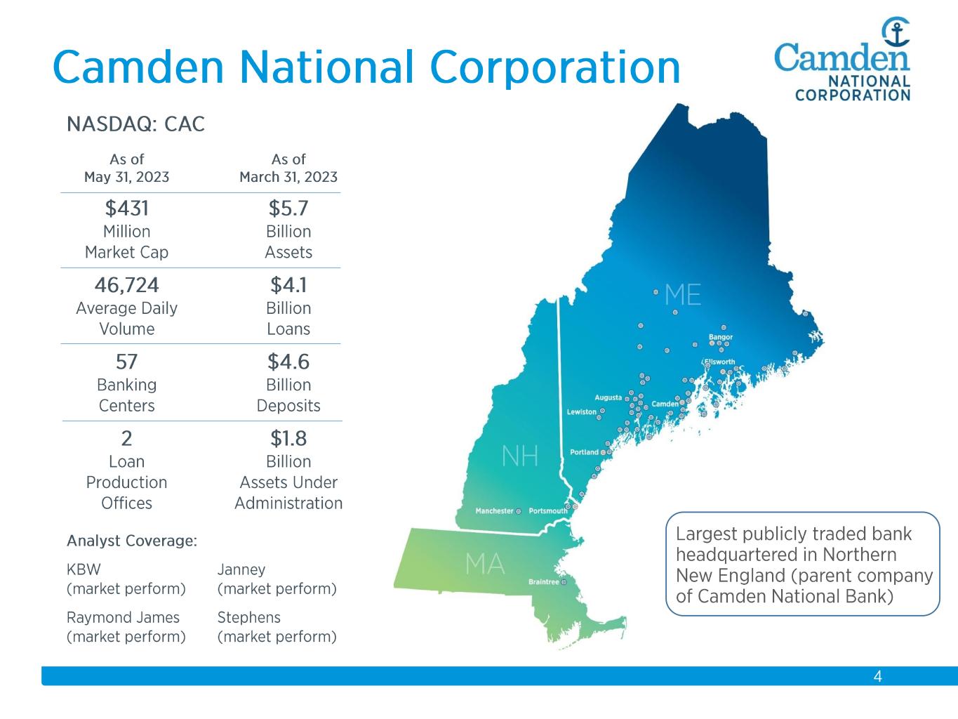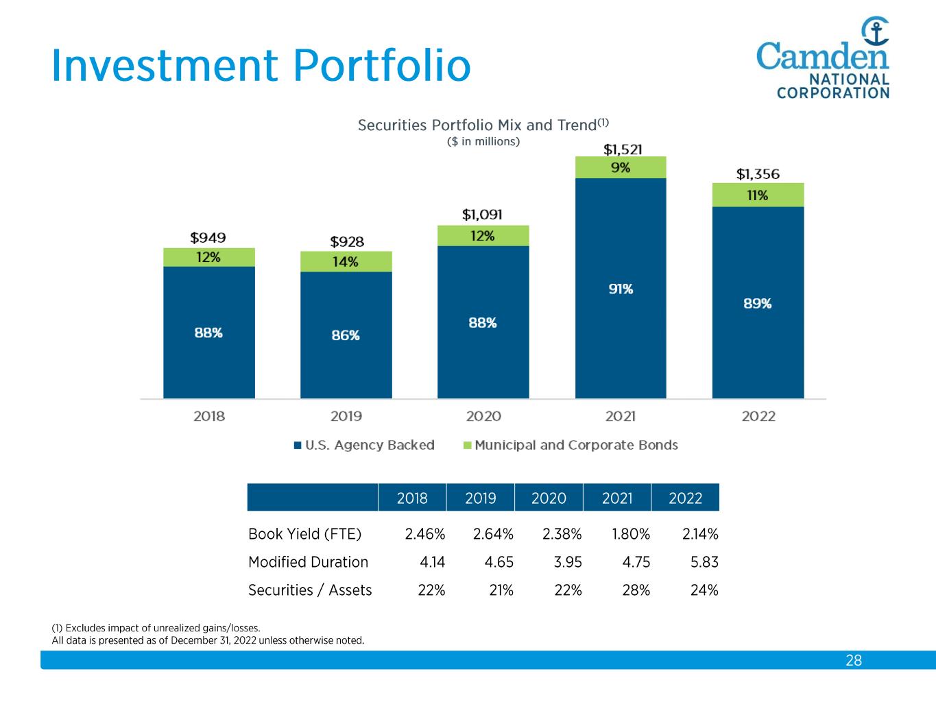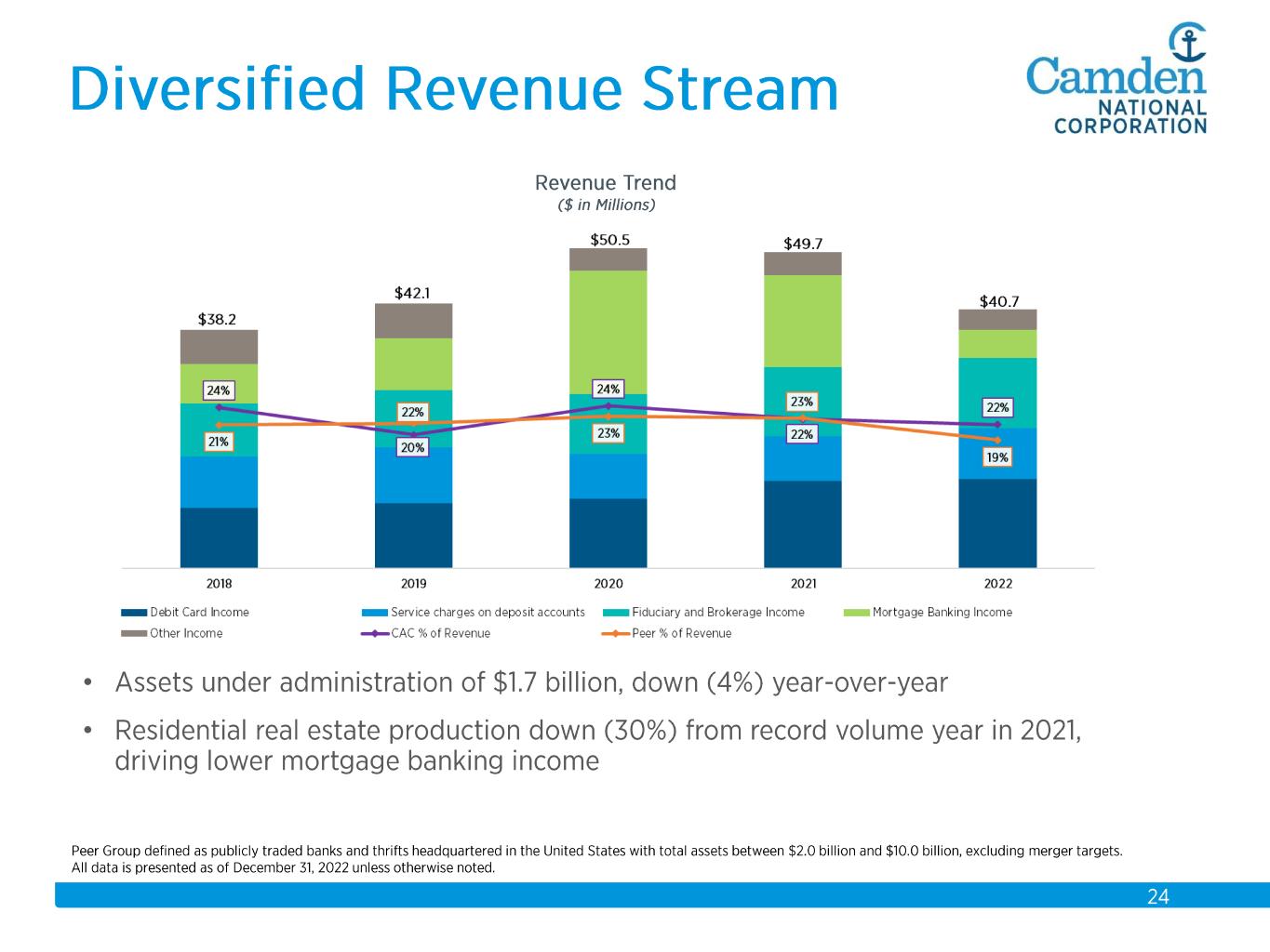 $2.3 $2.2 $2.3 $2.3 $2.6 $2.6 $2.8 $3.7 $3.9 $4.1 $4.3 $4.4 $4.9 $5.5 $5.7 2008 2009 2010 2011 2012 2013 2014 2015 2016 2017 2018 2019 2020 2021 2022 Total Assets $ in billions Acquisitions: 2008 Union Bankshares 2012 Bank of America (14 branches) 2015 The Bank of Maine Organic Growth 58% Acquisition Growth 42%