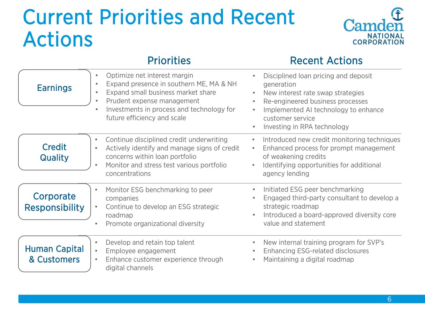 5 Why Camden National? Strong Long-Term Financial Performance and Shareholder Returns • History of strong financial performance and stable growth • Strong capital position with a history of growing dividends and repurchasing shares • Strong credit culture with a history of superior credit quality 5 Strong Brand Recognition and 2022 Market Share • 145+ year operating history, embedded deeply in the communities served • #3 overall deposit market share in Maine, #2 in community banks • #2 mortgage originator in Maine • Recognized by four different organizations for commitment to our customers and employees Committed to Quality Growth • Sustainable long-term growth organically and through opportunistic acquisitions • Strong and deep core deposit franchise • Expanded presence in local higher growth markets, including Southern Maine, New Hampshire, and Northern- Massachusetts
