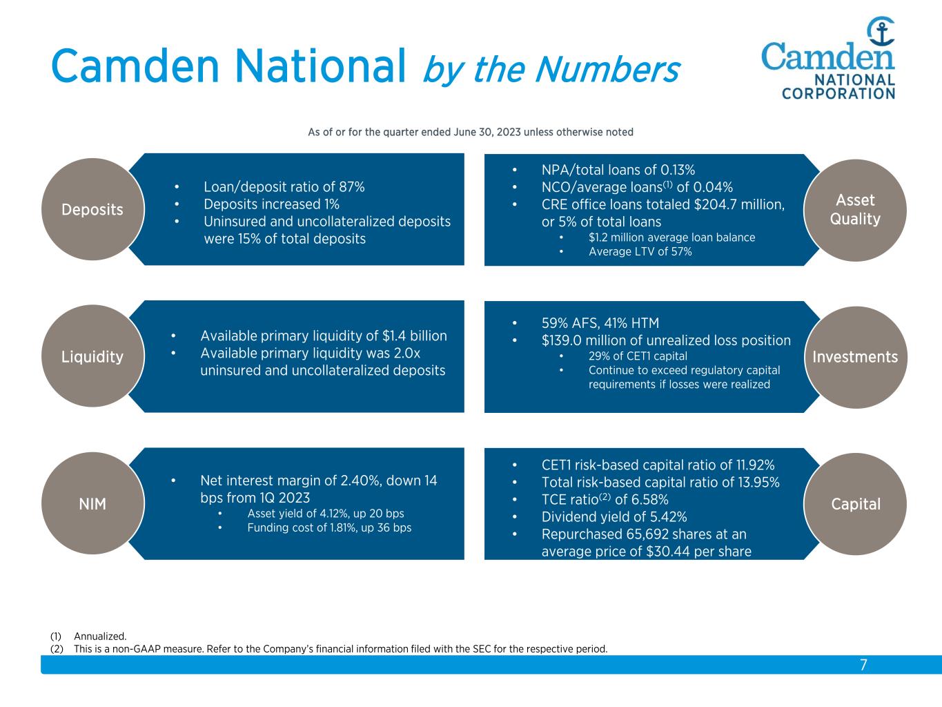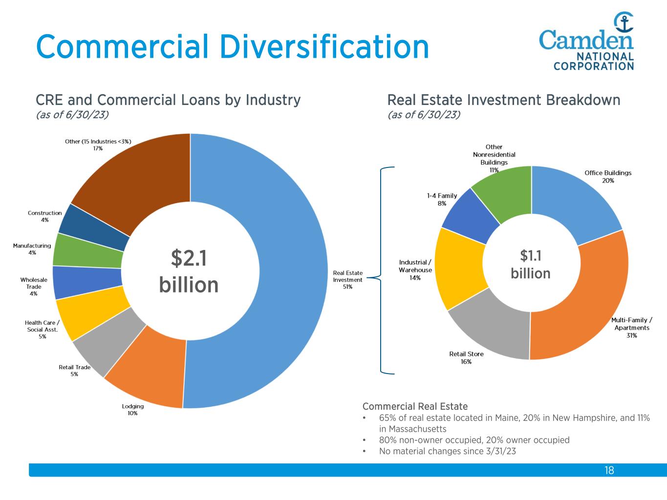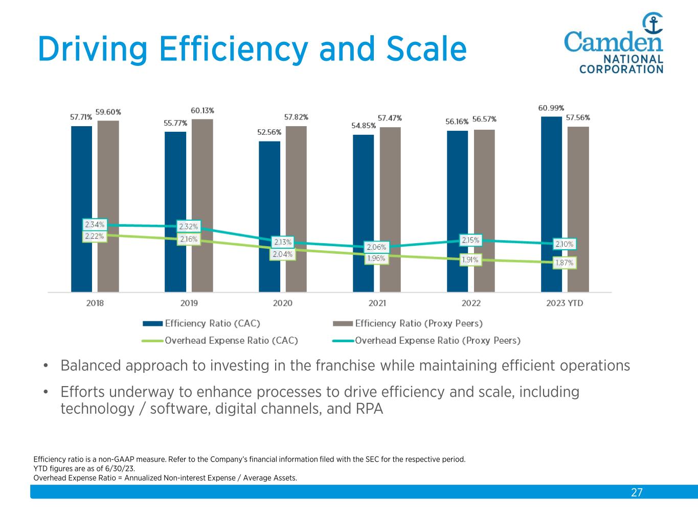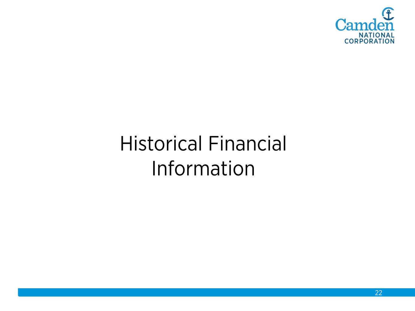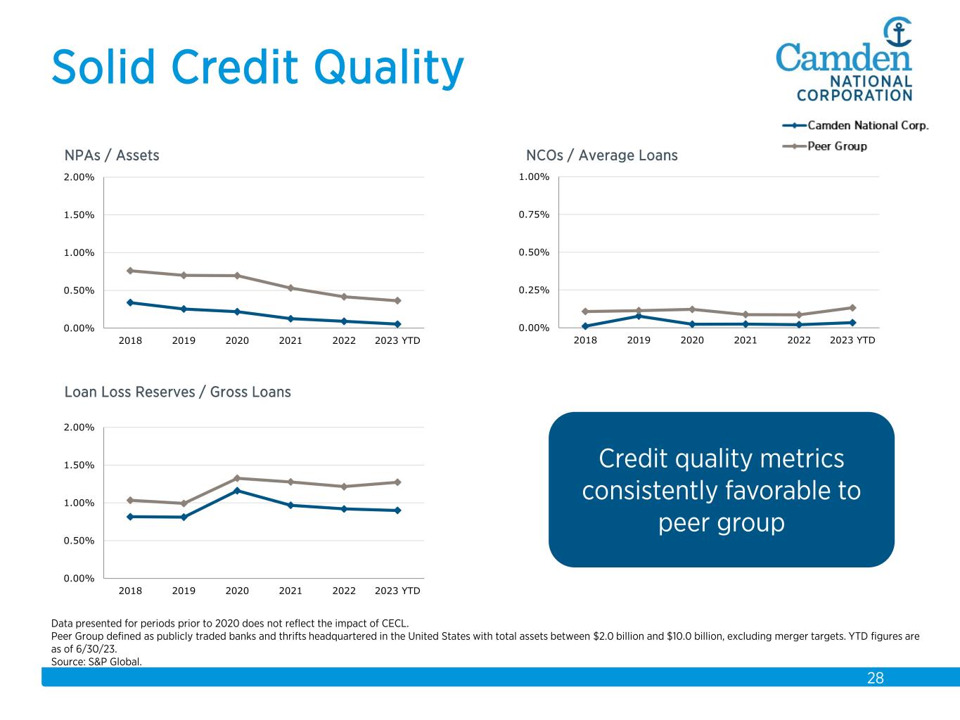 2 Forward Looking Statements 2 This presentation contains certain forward-looking statements within the meaning of the Private Securities Litigation Reform Act of 1995 and other federal securities laws, including certain plans, exceptions, goals, projections, and statements, which are subject to numerous risks, assumptions, and uncertainties. Forward-looking statements typically can be identified by the use of the words “believe,” “expect,” “anticipate,” “intend,” “estimate,” “assume,” “plan,” “target,” “potential” or “goal” or future or conditional verbs such as “will,” “may,” “might,” “should,” “could” and other expressions which predict or indicate future events or trends and which do not relate to historical matters. Forward-looking statements are not guarantees of future performance and involve risks, uncertainties and assumptions that are difficult for Camden National Corporation (the “Company”) to predict. The actual results, performance or achievements of the Company may differ materially from what is reflected in such forward-looking statements. The following factors, among others, could cause the Company’s financial performance to differ materially from the Company’s goals, plans, objectives, intentions, expectations and other forward-looking statements: (i) the impact of the COVID-19 pandemic; (ii) the impact of the war in Ukraine; (iii) weakness in the United States economy in general and the regional and local economies within the New England region and Maine, which could result in a deterioration of credit quality, an increase in the allowance for credit losses or a reduced demand for the Company’s credit or fee-based products and services; (iv) changes in trade, monetary, and fiscal policies and laws, including interest rate policies of the Board of Governors of the Federal Reserve System; (v) inflation, interest rate, market, and monetary fluctuations; (vi) ongoing competition in the labor markets and increased employee turnover; (vii) competitive pressures, including continued industry consolidation and the increased financial services provided by non-banks; (viii) deterioration in the value of the Company’s investment securities; (ix) volatility in the securities markets that could adversely affect the value or credit quality of the Company’s assets, impairment of goodwill, or the availability and terms of funding necessary to meet the Company’s liquidity needs; (x) changes in information technology and other operational risks, including cybersecurity, that require increased capital spending; (xi) changes in consumer spending and savings habits; (xii) changes in tax, banking, securities and insurance laws and regulations; (xiii) the outcome of pending and future litigation and governmental proceedings, including tax-related examinations and other matters; (xiii) changes in accounting policies, practices and standards, as may be adopted by the regulatory agencies as well as the Financial Accounting Standards Board, and other accounting standard setters; (xiv) turmoil and volatility in the financial services industry, including failures or rumors of failures of other depository institutions, which could affect the ability of depository institutions, including the Camden National, to attract and retain depositors, and could affect the ability of financial services providers, including the Company, to borrow or raise capital; (xv) actions taken by governmental agencies to stabilize the financial system and the effectiveness of such actions; (xvi) changes to regulatory capital requirements in response to recent developments affecting the banking sector; and (xvii) questions about the soundness of one or more financial institutions with which we do business. In addition, statements regarding the potential effects of the war in Ukraine, the COVID-19 pandemic and other notable national and global current events on the Company’s business, financial condition, liquidity and results of operations may constitute forward-looking statements and are subject to the risk that the actual effects may differ, possibly materially, from what is reflected in those forward-looking statements due to factors and future developments that are uncertain, unpredictable and in many cases beyond the Company's control. You should carefully review all of these risks, and be aware that there may be other factors that could cause the Company’s actual results to differ materially from those anticipated, including the risk factors listed in the Company’s filings with the SEC, including our Annual Report on Form 10-K for the year ended December 31, 2022, as updated by the Company's quarterly reports on Form 10-Q and other filings with the Securities and Exchange Commission. You should carefully review the risk factors described therein and should not place undue reliance on our forward-looking statements. These forward-looking statements were based on information, plans and estimates at the date of this presentation, and we undertake no obligation to update any forward-looking statements to reflect changes in underlying assumptions or factors, new information, future events or other changes, except to the extent required by applicable law or regulation.