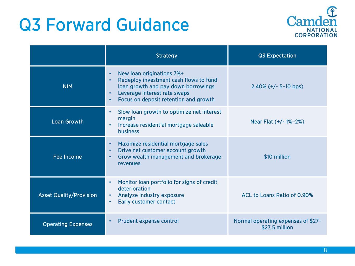 7 Camden National by the Numbers 7 Deposits Liquidity NIM Asset Quality Investments Capital As of or for the quarter ended June 30, 2023 unless otherwise noted • Loan/deposit ratio of 87% • Deposits increased 1% • Uninsured and uncollateralized deposits were 15% of total deposits • Available primary liquidity of $1.4 billion • Available primary liquidity was 2.0x uninsured and uncollateralized deposits • Net interest margin of 2.40%, down 14 bps from 1Q 2023 • Asset yield of 4.12%, up 20 bps • Funding cost of 1.81%, up 36 bps • NPA/total loans of 0.13% • NCO/average loans(1) of 0.04% • CRE office loans totaled $204.7 million, or 5% of total loans • $1.2 million average loan balance • Average LTV of 57% • CET1 risk-based capital ratio of 11.92% • Total risk-based capital ratio of 13.95% • TCE ratio(2) of 6.58% • Dividend yield of 5.42% • Repurchased 65,692 shares at an average price of $30.44 per share • 59% AFS, 41% HTM • $139.0 million of unrealized loss position • 29% of CET1 capital • Continue to exceed regulatory capital requirements if losses were realized (1) Annualized. (2) This is a non-GAAP measure. Refer to the Company’s financial information filed with the SEC for the respective period.