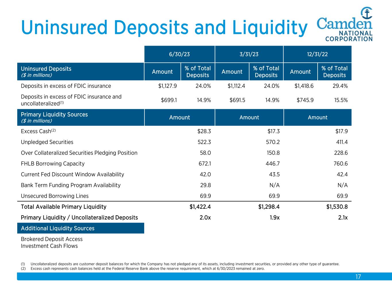 16 Interest Rate Sensitivity 16 Interest Rate Risk Position(1) • Liability sensitive Year 1 and asset sensitive Year 2; strategies employed have improved exposure to higher interest rates Current Strategy and Actions • Disciplined loan pricing • Manage deposit pricing on an exception- basis • Deposit acquisition through promotional offerings, primarily through MMDA and CDs • Executed $450 million of interest rate swaps through early July with a weighted pay-fixed strike rate of 3.90% and currently receiving Fed Funds OIS • $135 million borrowing under Bank Term Funding Program (one year maturity at 4.70% with no prepay penalty) (1) Assumes flat balance sheet, no changes in asset/funding mix, and a parallel and pro-rata shift in rates over a 12 month period. -3.93% 8.78% 3.06% 11.57% Year 1 Year 2 December 31, 2022 +200 bp -200 bp -1.01% 16.57% 2.32% 14.91% Year 1 Year 2 June 30, 2023 +200 bp -200 bp