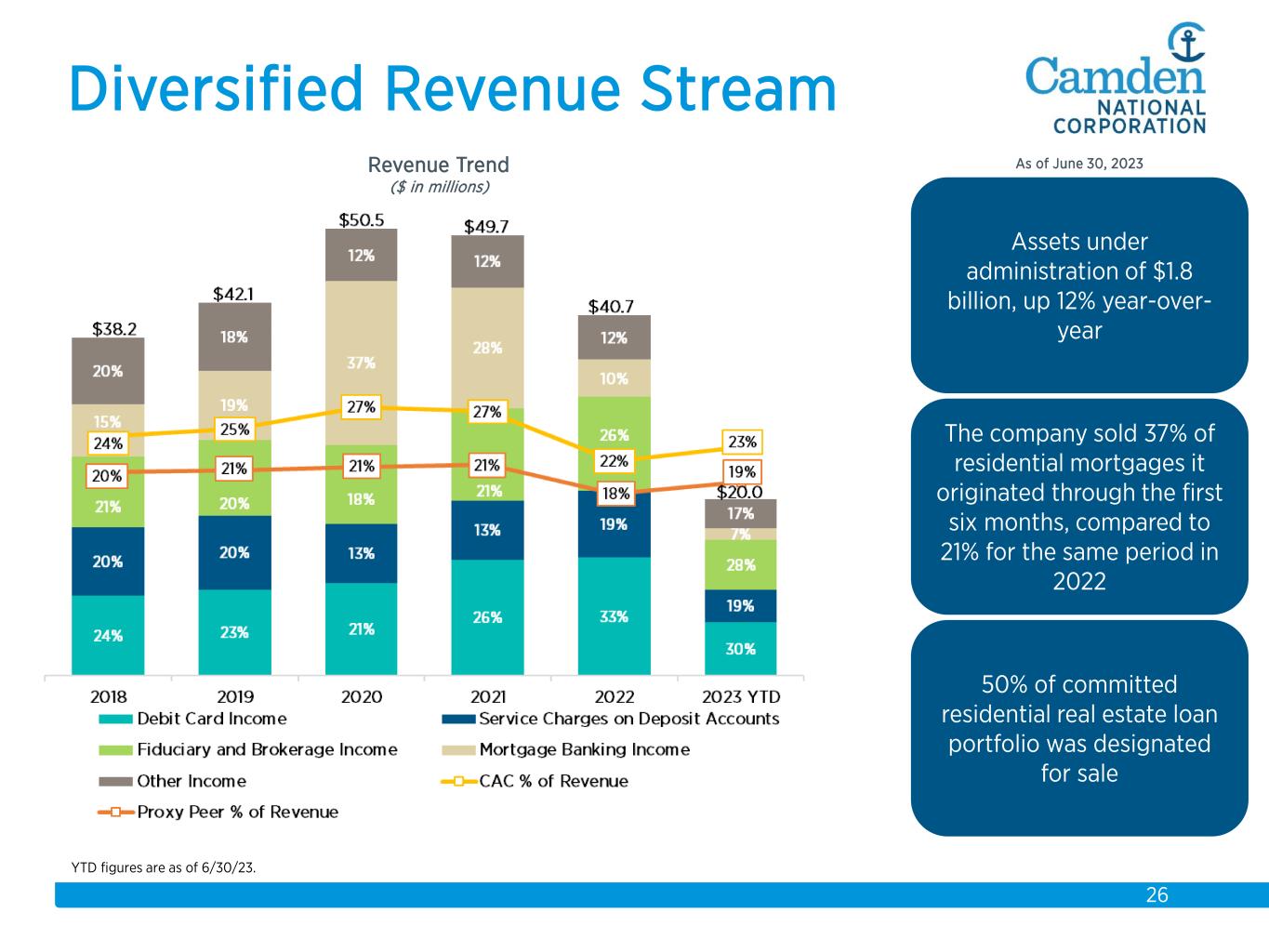 26 Diversified Revenue Stream Assets under administration of $1.8 billion, up 12% year-over- year The company sold 37% of residential mortgages it originated through the first six months, compared to 21% for the same period in 2022 26 Revenue Trend ($ in millions) YTD figures are as of 6/30/23. As of June 30, 2023 50% of committed residential real estate loan portfolio was designated for sale