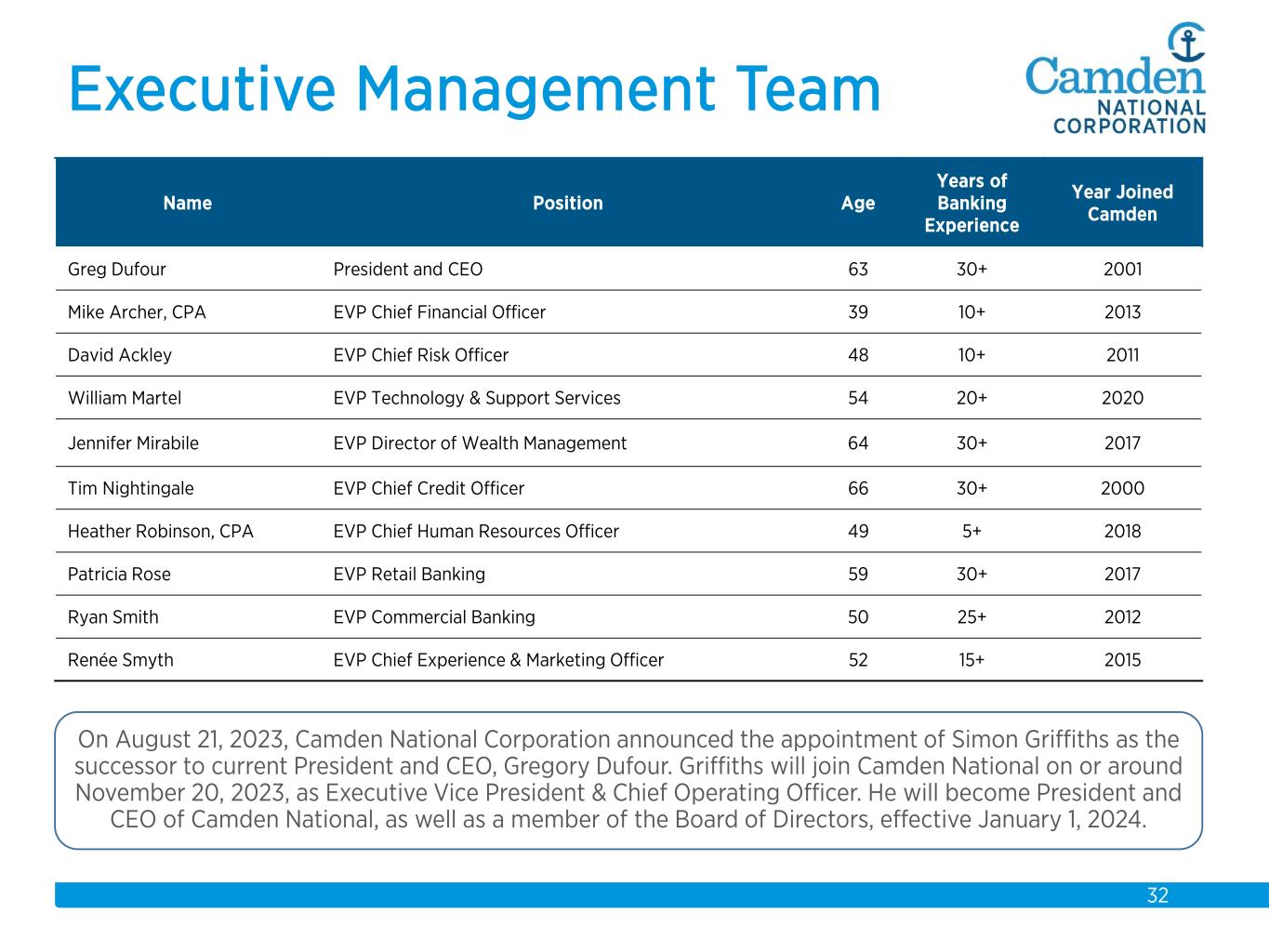 32 Executive Management Team 32 Name Position Age Years of Banking Experience Year Joined Camden Greg Dufour President and CEO 63 30+ 2001 Mike Archer, CPA EVP Chief Financial Officer 39 10+ 2013 David Ackley EVP Chief Risk Officer 48 10+ 2011 William Martel EVP Technology & Support Services 54 20+ 2020 Jennifer Mirabile EVP Director of Wealth Management 64 30+ 2017 Tim Nightingale EVP Chief Credit Officer 66 30+ 2000 Heather Robinson, CPA EVP Chief Human Resources Officer 49 5+ 2018 Patricia Rose EVP Retail Banking 59 30+ 2017 Ryan Smith EVP Commercial Banking 50 25+ 2012 Renée Smyth EVP Chief Experience & Marketing Officer 52 15+ 2015 On August 21, 2023, Camden National Corporation announced the appointment of Simon Griffiths as the successor to current President and CEO, Gregory Dufour. Griffiths will join Camden National on or around November 20, 2023, as Executive Vice President & Chief Operating Officer. He will become President and CEO of Camden National, as well as a member of the Board of Directors, effective January 1, 2024.