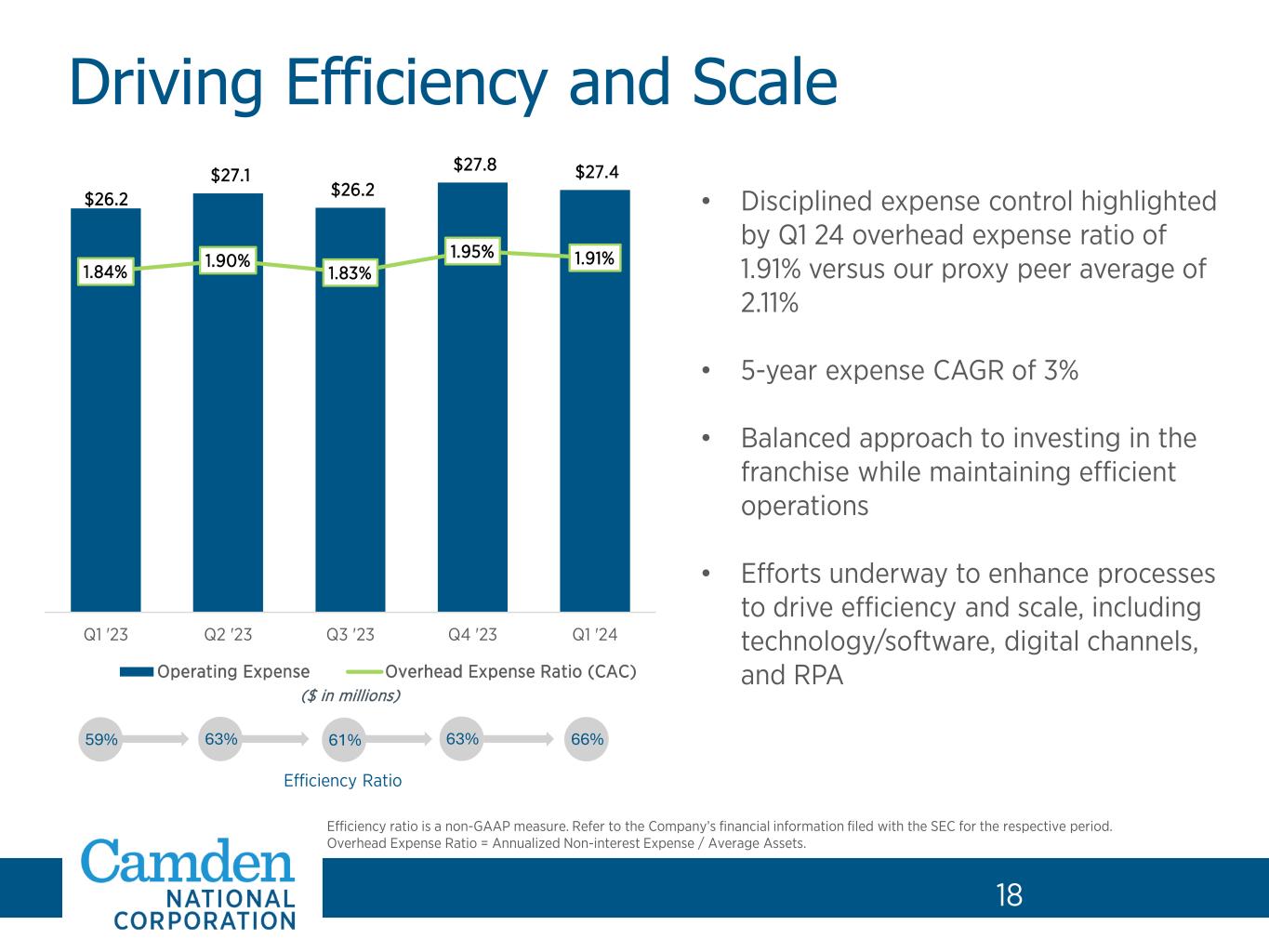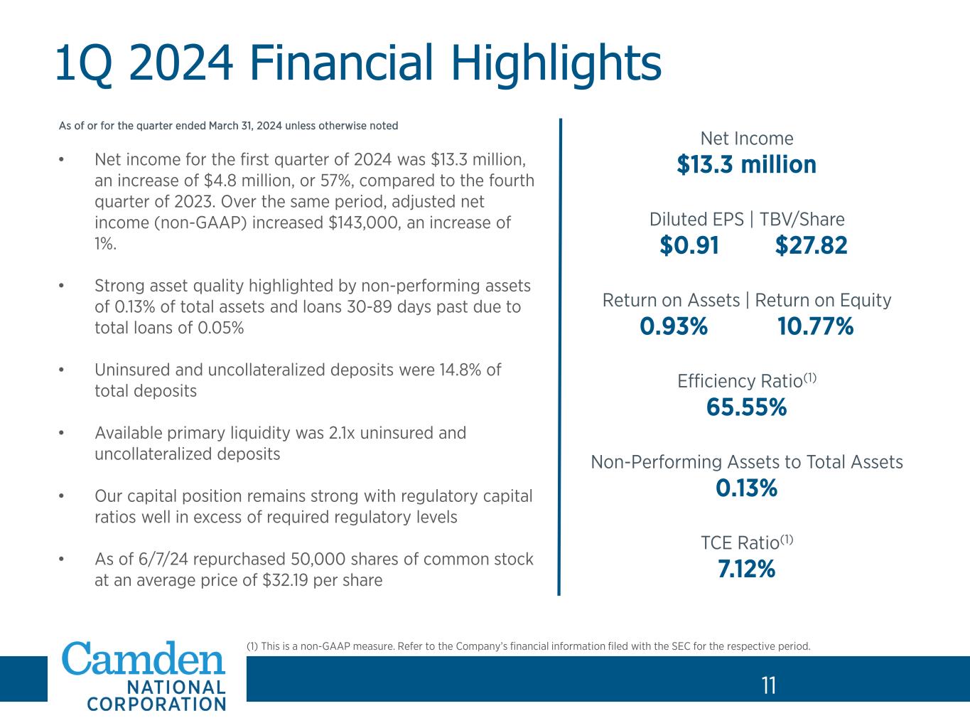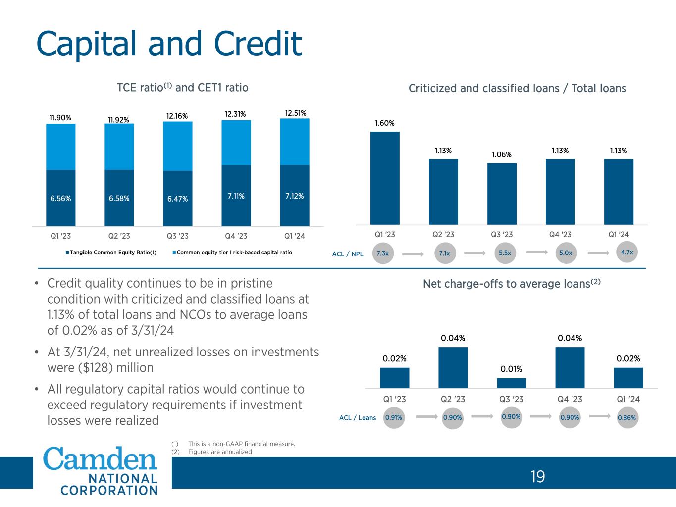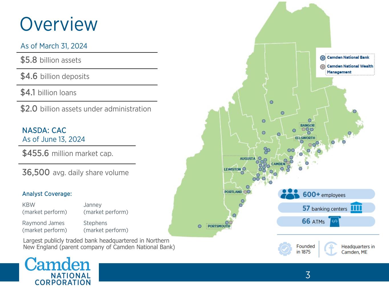 2 Forward-Looking Statements and Non-GAAP Financial Measures 2 Forward-Looking Statements. This presentation contains certain forward-looking statements within the meaning of the Private Securities Litigation Reform Act of 1995 and other federal securities laws, including certain plans, exceptions, goals, projections, and statements, which are subject to numerous risks, assumptions, and uncertainties. Forward-looking statements typically can be identified by the use of the words “believe,” “expect,” “anticipate,” “intend,” “estimate,” “assume,” “plan,” “target,” “potential” or “goal” or future or conditional verbs such as “will,” “may,” “might,” “should,” “could” and other expressions which predict or indicate future events or trends and which do not relate to historical matters. Forward-looking statements are not guarantees of future performance and involve risks, uncertainties, and assumptions that are difficult for Camden National Corporation (the “Company”) to predict. The actual results, performance or achievements of the Company may differ materially from what is reflected in such forward-looking statements. The following factors, among others, could cause the Company’s financial performance to differ materially from the Company’s goals, plans, objectives, intentions, expectations and other forward-looking statements: (i) weakness in the United States economy in general and the regional and local economies within the New England region and Maine, which could result in a deterioration of credit quality, an increase in the allowance for credit losses or a reduced demand for the Company’s credit or fee-based products and services; (ii) changes in trade, monetary, and fiscal policies and laws, including interest rate policies of the Board of Governors of the Federal Reserve System; (iii) inflation, interest rate, market, and monetary fluctuations; (iv) ongoing competition in the labor markets and increased employee turnover; (v) the adequacy of succession planning for key executives or other personnel, and the Company’s ability to transition effectively to new members of the senior executive team; (vi) competitive pressures, including continued industry consolidation and the increased financial services provided by non-banks; (vii) deterioration in the value of the Company’s investment securities; (viii) commercial real estate vacancies and their impact on the ability of borrowers to repay their loans; (ix) volatility in the securities markets that could adversely affect the value or credit quality of the Company’s assets, impairment of goodwill, or the availability and terms of funding necessary to meet the Company’s liquidity needs; (x) changes in information technology and other operational risks, including cybersecurity, that require increased capital spending; (xi) changes in consumer spending and savings habits; (xii) changes in tax, banking, securities and insurance laws and regulations; (xiii) the outcome of pending and future litigation and governmental proceedings, including tax-related examinations and other matters; (xiv) changes in accounting policies, practices and standards, as may be adopted by the regulatory agencies as well as the Financial Accounting Standards Board, and other accounting standard setters; (xv) the effects of climate change on the Company and its customers, borrowers or service providers; (xvi) the effects of civil unrest, international hostilities, including the war in Ukraine and conflict in the Middle East, or other geopolitical events; (xvii) the effects of epidemics and pandemics; (xviii) turmoil and volatility in the financial services industry, including failures or rumors of failures of other depository institutions, which could affect the ability of depository institutions, including Camden National, to attract and retain depositors, and could affect the ability of financial services providers, including the Company, to borrow or raise capital; (xix) actions taken by governmental agencies to stabilize the financial system and the effectiveness of such actions; (xx) increases in deposit insurance assessments due to bank failures; (xxi) changes to regulatory capital requirements in response to recent developments affecting the banking sector; and (xxii) questions about the soundness of one or more financial institutions with which we do business. In addition, statements regarding the potential effects of notable national and global current events on the Company’s business, financial condition, liquidity and results of operations may constitute forward-looking statements and are subject to the risk that the actual effects may differ, possibly materially, from what is reflected in those forward-looking statements due to factors and future developments that are uncertain, unpredictable and in many cases beyond the Company's control. You should carefully review all of these factors, and be aware that there may be other factors that could cause differences, including the risk factors listed in our Annual Report on Form 10-K for the year ended December 31, 2023, as updated by the Company's quarterly reports on Form 10-Q and other filings with the Securities and Exchange Commission. You should carefully review the risk factors described therein and should not place undue reliance on our forward-looking statements. These forward-looking statements were based on information, plans and estimates at the date of this presentation, and we undertake no obligation to update any forward-looking statements to reflect changes in underlying assumptions or factors, new information, future events or other changes, except to the extent required by applicable law or regulation. Non-GAAP. This presentation includes certain non-GAAP financial measures. Management uses these non-GAAP financial measures for purposes of measuring our performance against our peer group and other financial insti