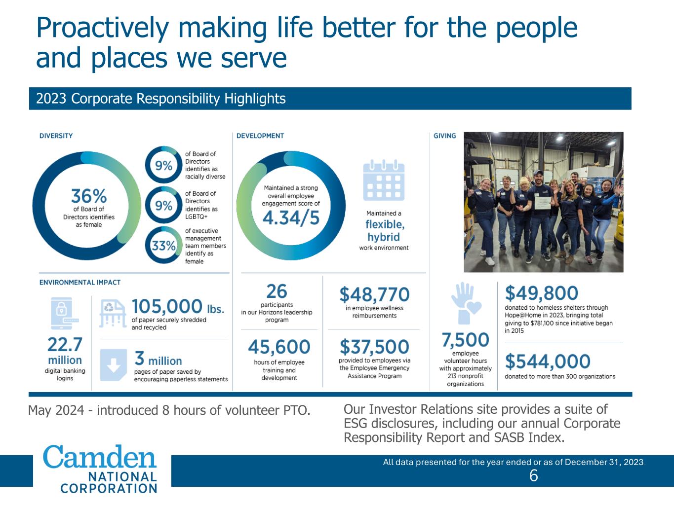 6 2023 Corporate Responsibility Highlights All data presented for the year ended or as of December 31, 2023. Proactively making life better for the people and places we serve May 2024 - introduced 8 hours of volunteer PTO. Our Investor Relations site provides a suite of ESG disclosures, including our annual Corporate Responsibility Report and SASB Index. 6