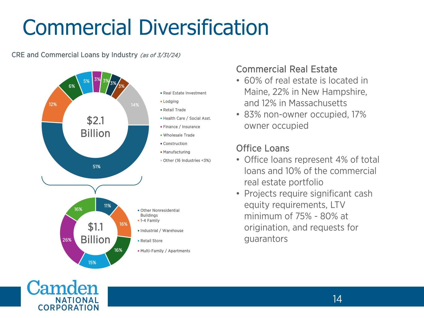 13 10% 10% 10% 10% 10% 41% 41% 41% 41% 41% 43% 43% 43% 43% 43% 6% 6% 6% 6% 6% 4.50% 4.73% 4.85% 4.96% 5.00% - 500,000 1,000,000 1,500,000 2,000,000 2,500,000 3,000,000 3,500,000 4,000,000 4,500,000 0.00% 1.00% 2.00% 3.00% 4.00% 5.00% 6.00% Q1 '23 Q2 '23 Q3 '23 Q4 '23 Q1 '24 Commercial Commercial Real Estate Residential Real Estate Home Equity and Consumer Loan Yield $4.1 $4.1 $4.1 $4.1 $4.1 Loan Portfolio 13 ($ in billions) As of March 31, 2024 • Disciplined loan pricing continues to be funded with investment cash flow • 39% of loans are adjustable or variable rate • 21% of loans reprice within 12 months • YoY loan beta of – 62%