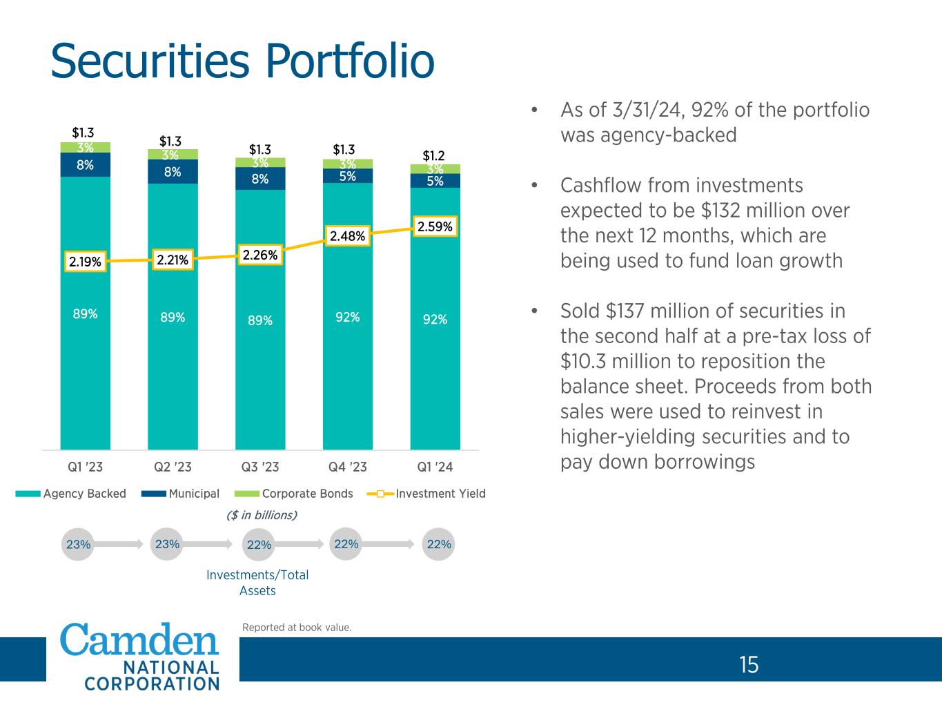 14 11% 16% 16% 15% 26% 16% Other Nonresidential Buildings 1-4 Family Industrial / Warehouse Retail Store Multi-Family / Apartments 51% 12% 6% 5% 3% 3% 3% 3% 14% Real Estate Investment Lodging Retail Trade Health Care / Social Asst. Finance / Insurance Wholesale Trade Construction Manufacturing Other (16 Industries <3%) Commercial Diversification 14 CRE and Commercial Loans by Industry (as of 3/31/24) Commercial Real Estate • 60% of real estate is located in Maine, 22% in New Hampshire, and 12% in Massachusetts • 83% non-owner occupied, 17% owner occupied Office Loans • Office loans represent 4% of total loans and 10% of the commercial real estate portfolio • Projects require significant cash equity requirements, LTV minimum of 75% - 80% at origination, and requests for guarantors $2.1 Billion $1.1 Billion