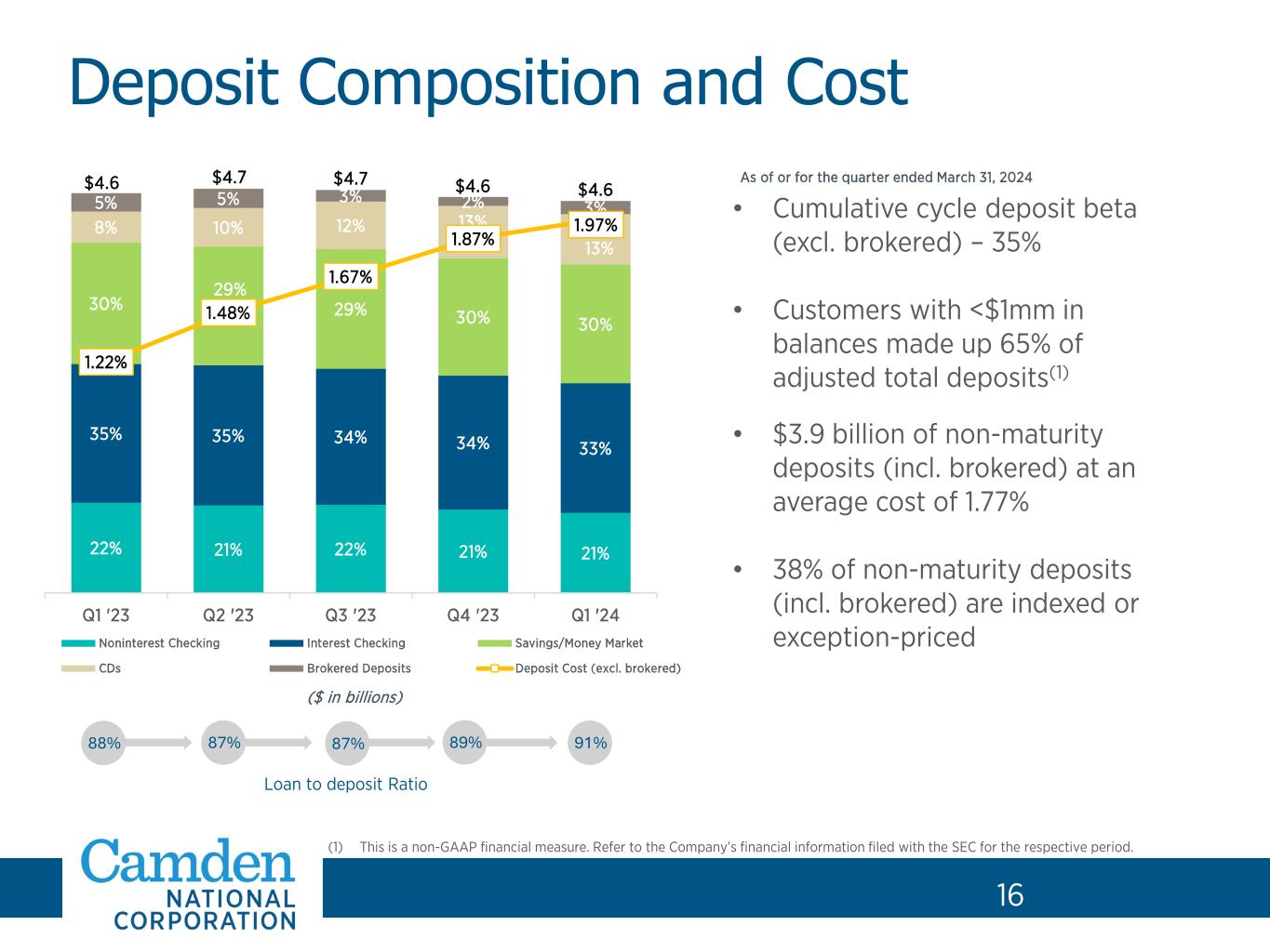 15 89% 89% 89% 92% 92% 8% 8% 8% 5% 5% 3% 3% 3% 3% 3% 2.19% 2.21% 2.26% 2.48% 2.59% 0.00% 0.50% 1.00% 1.50% 2.00% 2.50% 3.00% 3.50% 4.00% - 0,000 0,000 0,000 0,000 0,000 0,000 0,000 Q1 '23 Q2 '23 Q3 '23 Q4 '23 Q1 '24 Agency Backed Municipal Corporate Bonds Investment Yield $1.3 $1.3 $1.3 $1.3 $1.2 • As of 3/31/24, 92% of the portfolio was agency-backed • Cashflow from investments expected to be $132 million over the next 12 months, which are being used to fund loan growth • Sold $137 million of securities in the second half at a pre-tax loss of $10.3 million to reposition the balance sheet. Proceeds from both sales were used to reinvest in higher-yielding securities and to pay down borrowings Investments/Total Assets Securities Portfolio 15 Reported at book value. ($ in billions) 23% 23% 22% 22% 22%