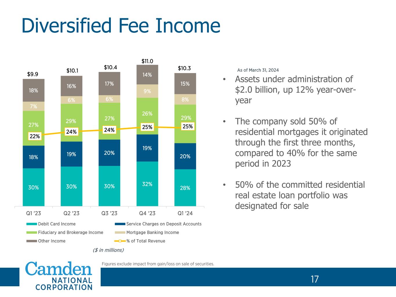 16 22% 21% 22% 21% 21% 35% 35% 34% 34% 33% 30% 29% 29% 30% 30% 8% 10% 12% 13% 13% 5% 5% 3% 2% 3% 1.22% 1.48% 1.67% 1.87% 1.97% - 1,000,000 2,000,000 3,000,000 4,000,000 5,000,000 00% 50% 00% 50% 00% 50% Q1 '23 Q2 '23 Q3 '23 Q4 '23 Q1 '24 Noninterest Checking Interest Checking Savings/Money Market CDs Brokered Deposits Deposit Cost (excl. brokered) $4.6 $4.7 $4.7 $4.6 $4.6 • Cumulative cycle deposit beta (excl. brokered) – 35% • Customers with <$1mm in balances made up 65% of adjusted total deposits(1) • $3.9 billion of non-maturity deposits (incl. brokered) at an average cost of 1.77% • 38% of non-maturity deposits (incl. brokered) are indexed or exception-priced Deposit Composition and Cost 16 ($ in billions) As of or for the quarter ended March 31, 2024 (1) This is a non-GAAP financial measure. Refer to the Company’s financial information filed with the SEC for the respective period. Loan to deposit Ratio 88% 87% 87% 89% 91%