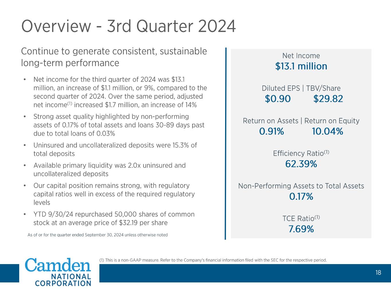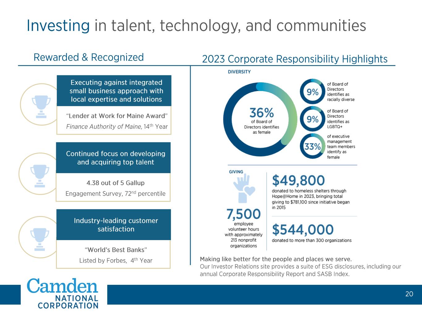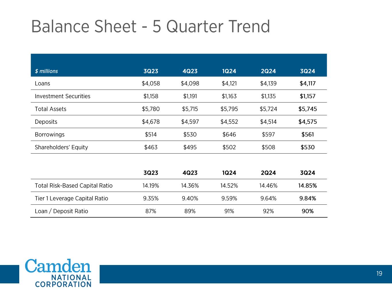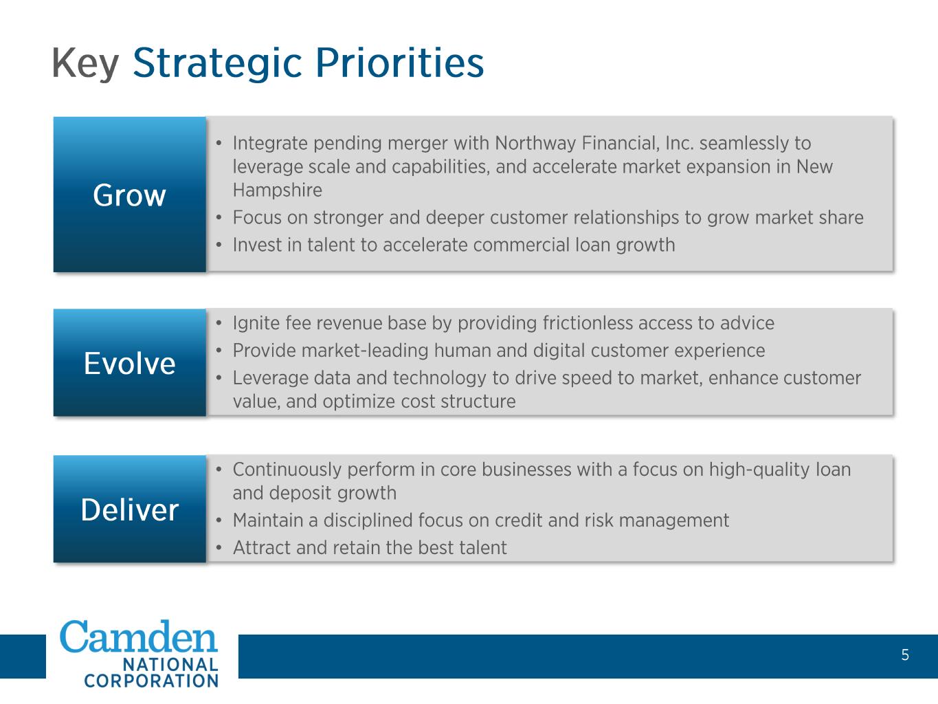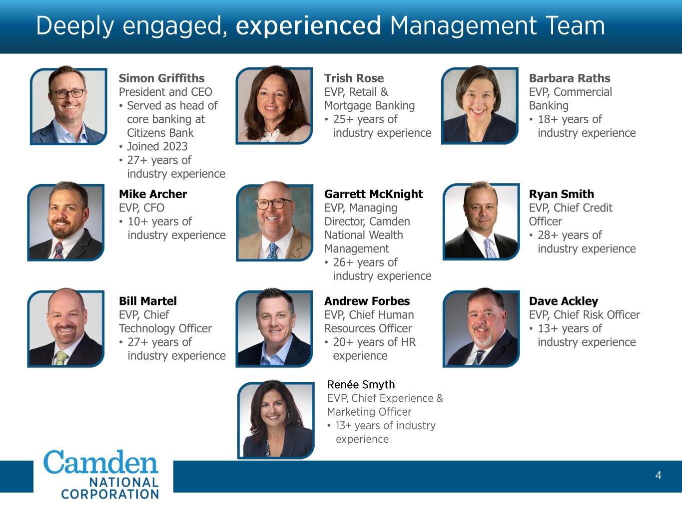 Simon Griffiths President and CEO • Served as head of core banking at Citizens Bank • Joined 2023 • 27+ years of industry experience Trish Rose EVP, Retail & Mortgage Banking • 25+ years of industry experience Barbara Raths EVP, Commercial Banking • 18+ years of industry experience Mike Archer EVP, CFO • 10+ years of industry experience Garrett McKnight EVP, Managing Director, Camden National Wealth Management • 26+ years of industry experience Ryan Smith EVP, Chief Credit Officer • 28+ years of industry experience Bill Martel EVP, Chief Technology Officer • 27+ years of industry experience Andrew Forbes EVP, Chief Human Resources Officer • 20+ years of HR experience Dave Ackley EVP, Chief Risk Officer • 13+ years of industry experience •