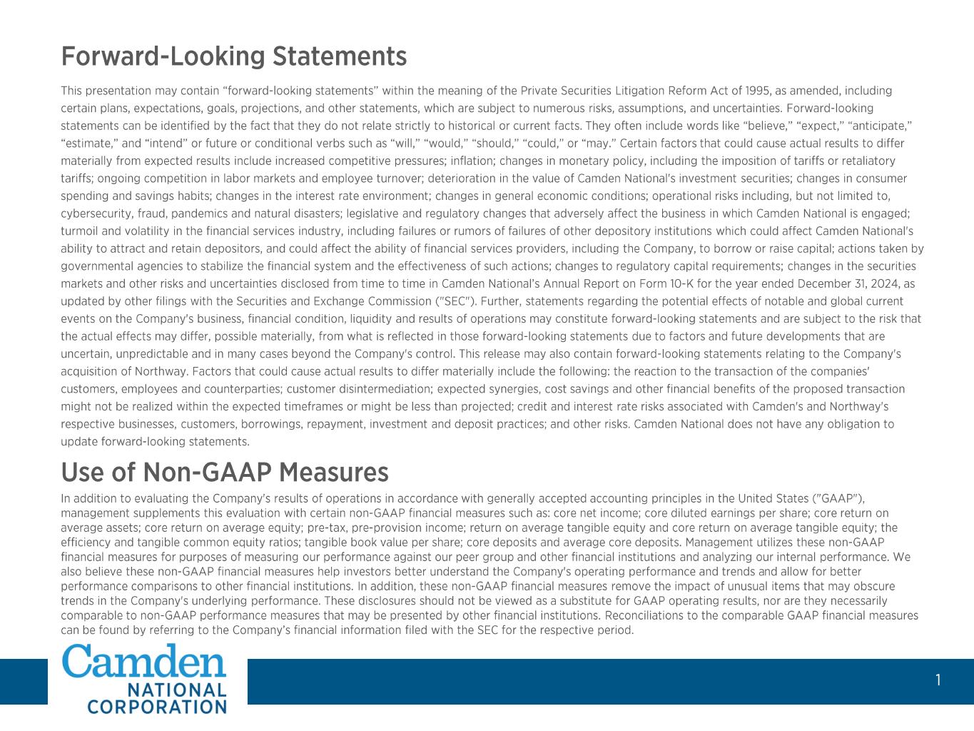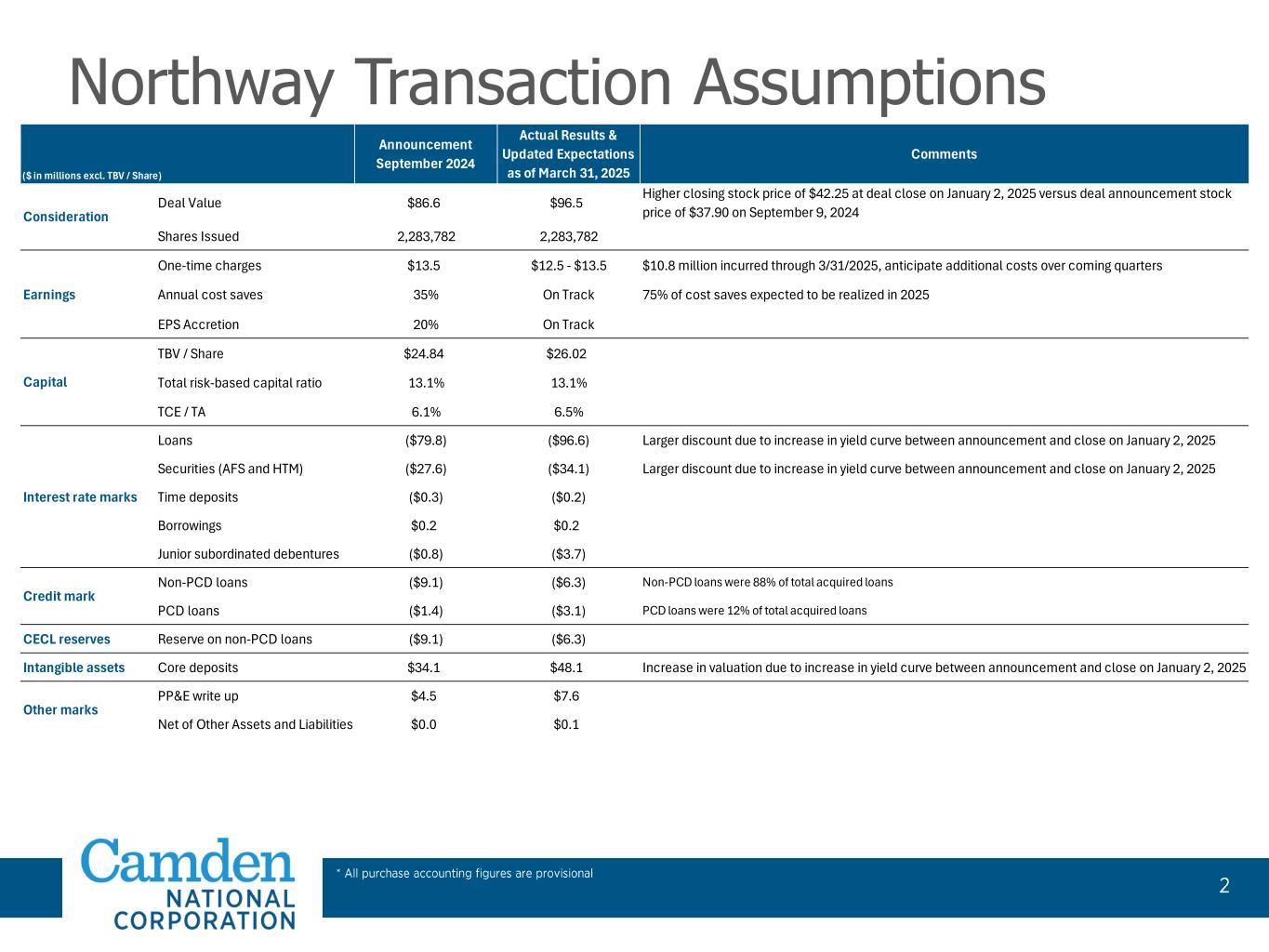 Northway Transaction Assumptions ($ in millions excl. TBV / Share) Announcement September 2024 Actual Results & Updated Expectations as of March 31, 2025 Comments Deal Value $86.6 $96.5 Higher closing stock price of $42.25 at deal close on January 2, 2025 versus deal announcement stock price of $37.90 on September 9, 2024 Shares Issued 2,283,782 2,283,782 One-time charges $13.5 $12.5 - $13.5 $10.8 million incurred through 3/31/2025, anticipate additional costs over coming quarters Annual cost saves 35% On Track 75% of cost saves expected to be realized in 2025 EPS Accretion 20% On Track TBV / Share $24.84 $26.02 Total risk-based capital ratio 13.1% 13.1% TCE / TA 6.1% 6.5% Loans ($79.8) ($96.6) Larger discount due to increase in yield curve between announcement and close on January 2, 2025 Securities (AFS and HTM) ($27.6) ($34.1) Larger discount due to increase in yield curve between announcement and close on January 2, 2025 Time deposits ($0.3) ($0.2) Borrowings $0.2 $0.2 Junior subordinated debentures ($0.8) ($3.7) Non-PCD loans ($9.1) ($6.3) Non-PCD loans were 88% of total acquired loans PCD loans ($1.4) ($3.1) PCD loans were 12% of total acquired loans CECL reserves Reserve on non-PCD loans ($9.1) ($6.3) Intangible assets Core deposits $34.1 $48.1 Increase in valuation due to increase in yield curve between announcement and close on January 2, 2025 PP&E write up $4.5 $7.6 Net of Other Assets and Liabilities $0.0 $0.1 Other marks Consideration Earnings Interest rate marks Capital Credit mark
