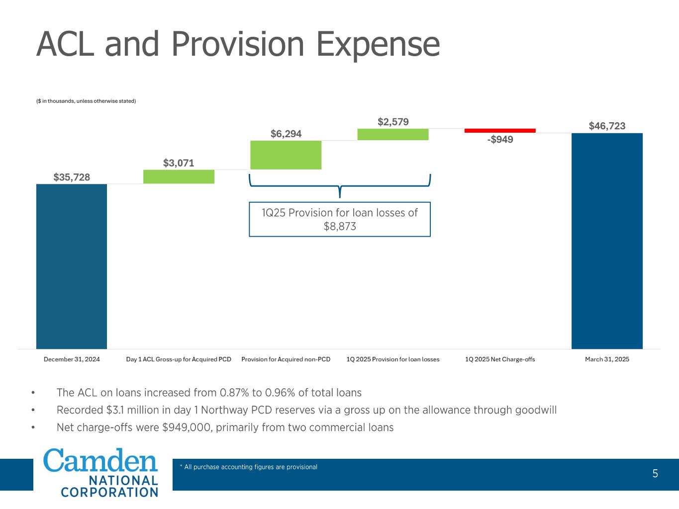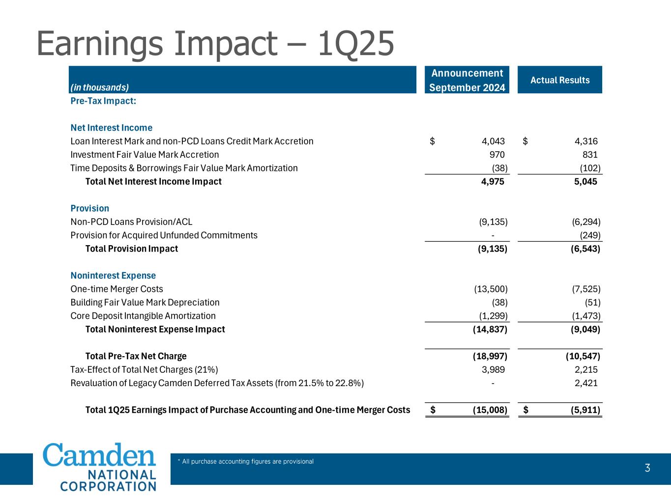 Earnings Impact – 1Q25 (in thousands) Announcement September 2024 Actual Results Pre-Tax Impact: Net Interest Income Loan Interest Mark and non-PCD Loans Credit Mark Accretion 4,043$ 4,316$ Investment Fair Value Mark Accretion 970 831 Time Deposits & Borrowings Fair Value Mark Amortization (38) (102) Total Net Interest Income Impact 4,975 5,045 Provision Non-PCD Loans Provision/ACL (9,135) (6,294) Provision for Acquired Unfunded Commitments - (249) Total Provision Impact (9,135) (6,543) Noninterest Expense One-time Merger Costs (13,500) (7,525) Building Fair Value Mark Depreciation (38) (51) Core Deposit Intangible Amortization (1,299) (1,473) Total Noninterest Expense Impact (14,837) (9,049) Total Pre-Tax Net Charge (18,997) (10,547) Tax-Effect of Total Net Charges (21%) 3,989 2,215 Revaluation of Legacy Camden Deferred Tax Assets (from 21.5% to 22.8%) - 2,421 Total 1Q25 Earnings Impact of Purchase Accounting and One-time Merger Costs (15,008)$ (5,911)$