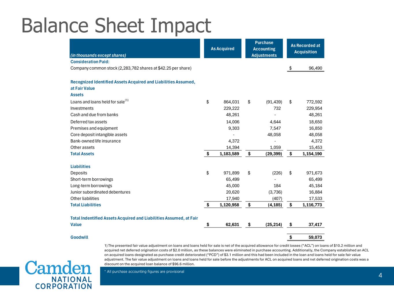 Balance Sheet Impact 1) The presented fair value adjustment on loans and loans held for sale is net of the acquired allowance for credit losses (“ACL”) on loans of $10.2 million and acquired net deferred origination costs of $2.0 million, as these balances were eliminated in purchase accounting. Additionally, the Company established an ACL on acquired loans designated as purchase credit deteriorated (“PCD”) of $3.1 million and this had been included in the loan and loans held for sale fair value adjustment. The fair value adjustment on loans and loans held for sale before the adjustments for ACL on acquired loans and net deferred origination costs was a discount on the acquired loan balance of $96.6 million. (in thousands except shares) As Acquired Purchase Accounting Adjustments As Recorded at Acquisition Consideration Paid: Company common stock (2,283,782 shares at $42.25 per share) 96,490$ Assets Loans and loans held for sale(1) 864,031$ (91,439)$ 772,592$ Investments 229,222 732 229,954 Cash and due from banks 48,261 - 48,261 Deferred tax assets 14,006 4,644 18,650 Premises and equipment 9,303 7,547 16,850 Core deposit intangible assets - 48,058 48,058 Bank-owned life insurance 4,372 - 4,372 Other assets 14,394 1,059 15,453 Total Assets 1,183,589$ (29,399)$ 1,154,190$ Liabilities Deposits 971,899$ (226)$ 971,673$ Short-term borrowings 65,499 - 65,499 Long-term borrowings 45,000 184 45,184 Junior subordinated debentures 20,620 (3,736) 16,884 Other liabilities 17,940 (407) 17,533 Total Liabilities 1,120,958$ (4,185)$ 1,116,773$ 62,631$ (25,214)$ 37,417$ Goodwill 59,073$ Recognized Identified Assets Acquired and Liabilities Assumed, at Fair Value Total Indentified Assets Acquired and Liabilities Assumed, at Fair Value