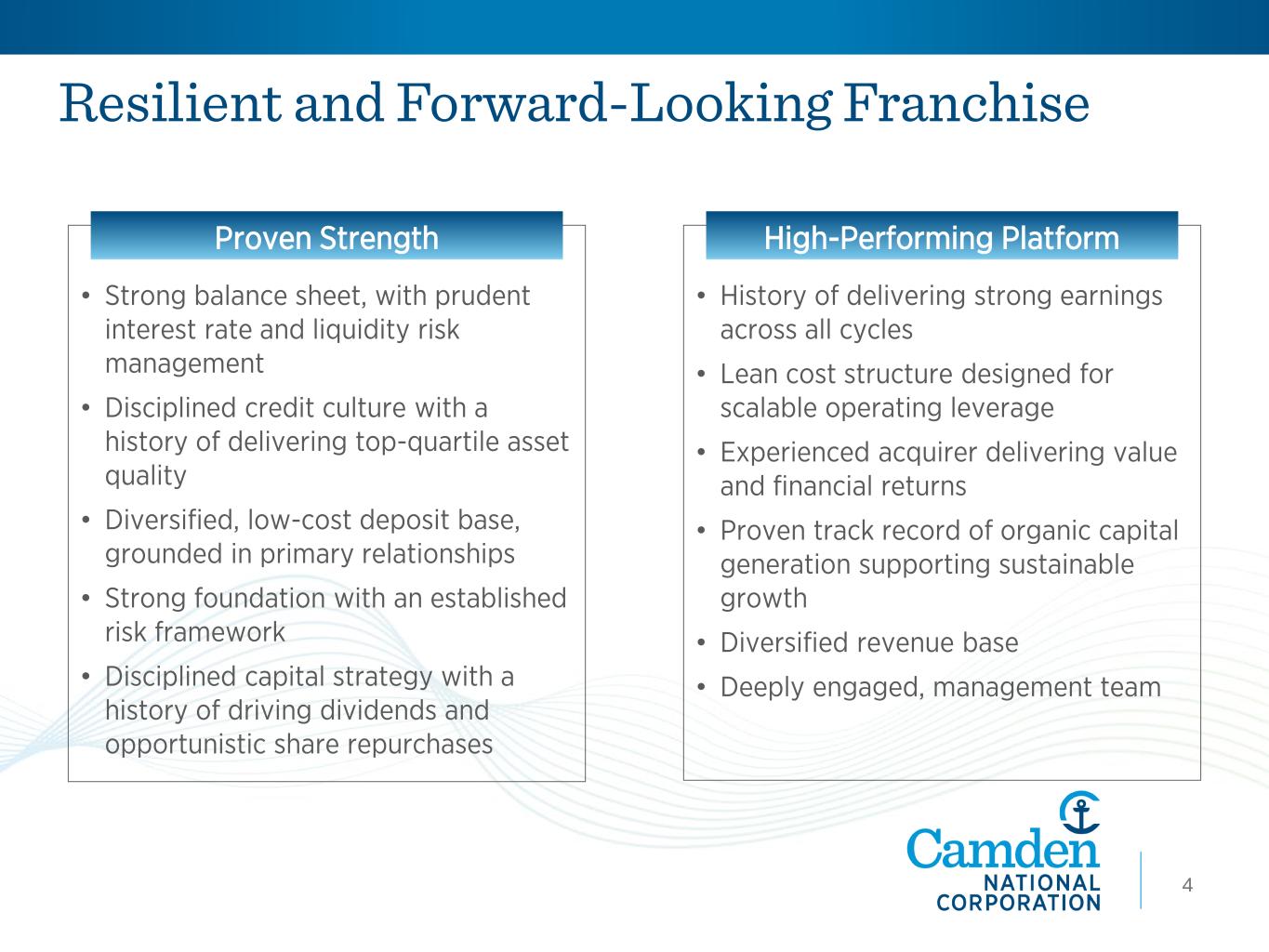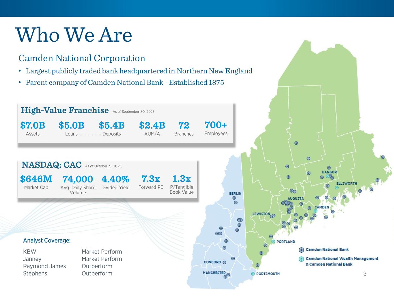 As of September 30, 2025 2 Camden National Corporation • Largest publicly traded bank headquartered in Northern New England • Parent company of Camden National Bank - Established 1875 Who We Are 3 High-Value Franchise $7.0B Assets $5.0B Loans $5.4B Deposits 700+ Employees 72 Branches $2.4B AUM/A As of September 30, 2025 NASDAQ: CAC $646M Market Cap 74,000 Avg. Daily Share Volume 4.40% Divided Yield 7.3x Forward PE As of October 31, 2025 Analyst Coverage: KBW Janney Raymond James Stephens Market Perform Market Perform Outperform Outperform 1.3x P/Tangible Book Value