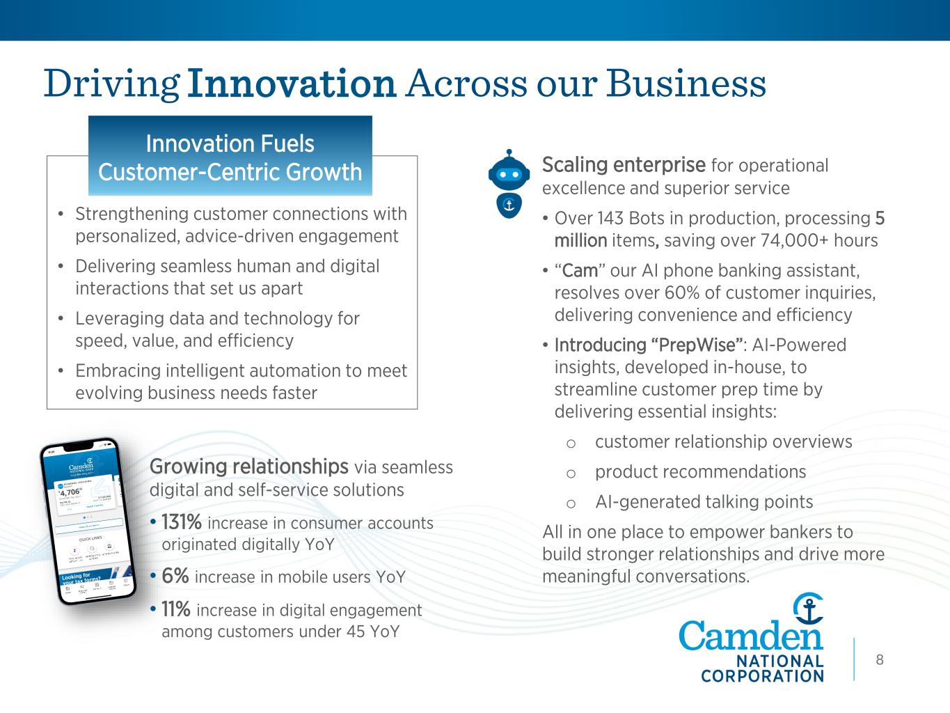 Growing relationships via seamless digital and self-service solutions • 131% increase in consumer accounts originated digitally YoY • 6% increase in mobile users YoY • 11% increase in digital engagement among customers under 45 YoY Driving Innovation Across our Business 7 Scaling enterprise for operational excellence and superior service • Over 143 Bots in production, processing 5 million items, saving over 74,000+ hours • “Cam” our AI phone banking assistant, resolves over 60% of customer inquiries, delivering convenience and efficiency • Introducing “PrepWise”: AI-Powered insights, developed in-house, to streamline customer prep time by delivering essential insights: o customer relationship overviews o product recommendations o AI-generated talking points All in one place to empower bankers to build stronger relationships and drive more meaningful conversations. • Strengthening customer connections with personalized, advice-driven engagement • Delivering seamless human and digital interactions that set us apart • Leveraging data and technology for speed, value, and efficiency • Embracing intelligent automation to meet evolving business needs faster Innovation Fuels Customer-Centric Growth 8