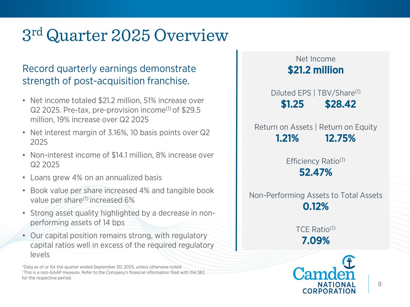 Residential Real Estate 40% Commercial Real Estate 43% Commercial 10% Home Equity and Consumer 7% Well Diversified Loan Portfolio • #2 residential mortgage lender in Maine • Growing HELOC portfolio, up 27% YoY • Acquired Northway loan portfolio aligns closely with the composition of Camden’s legacy portfolio • No large commercial credit concentrations • Total syndicated loan balance of $89mm, or 2% of total book • Adding experienced talent in high-growth markets of Southern Maine and New Hampshire • Focused on relationship pricing • Strategic technology investments to drive efficiency and customer experience Loan Pricing Characteristics • 42% of loans are adjustable or variable rate • 23% of loans reprice within 12 months Loan Portfolio Highlights (as of September 30, 2025) $5.0 billion 8 Loan Portfolio by Category (as of 9/30/25) ($ in millions) Loan Category Sep 30, 2025 Sep 30, 2024 % Increase (Decrease) Res idential Real Estate 2,01 8$ 1 ,762$ 1 4% Commercial Real Estate 2,1 74 1 ,708 27% Commercial 479 383 25% Home Equity and Consumer 332 264 26% 5,003$ 4,1 1 7$ 22% Average Loan Balances 4,931$ 4,1 33$ 1 9% Period Ended 10
