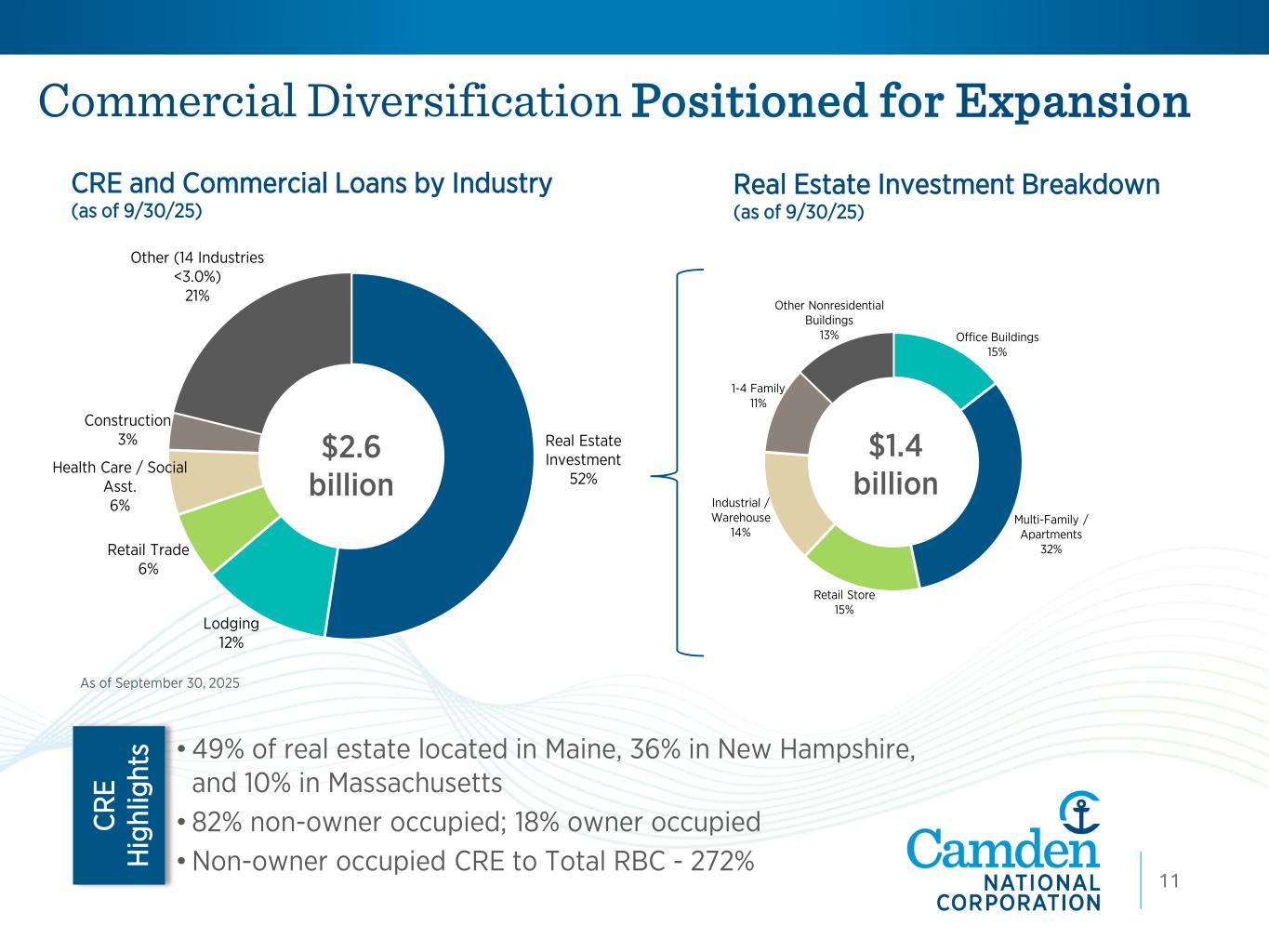 Commercial Diversification Positioned for Expansion 9 Real Estate Investment Breakdown (as of 9/30/25) CRE and Commercial Loans by Industry (as of 9/30/25) C R E H ig hl ig ht s • 49% of real estate located in Maine, 36% in New Hampshire, and 10% in Massachusetts • 82% non-owner occupied; 18% owner occupied • Non-owner occupied CRE to Total RBC - 272% As of September 30, 2025 Real Estate Investment 52% Lodging 12% Retail Trade 6% Health Care / Social Asst. 6% Construction 3% Other (14 Industries <3.0%) 21% Office Buildings 15% Multi-Family / Apartments 32% Retail Store 15% Industrial / Warehouse 14% 1-4 Family 11% Other Nonresidential Buildings 13% $2.6 billion $1.4 billion 11