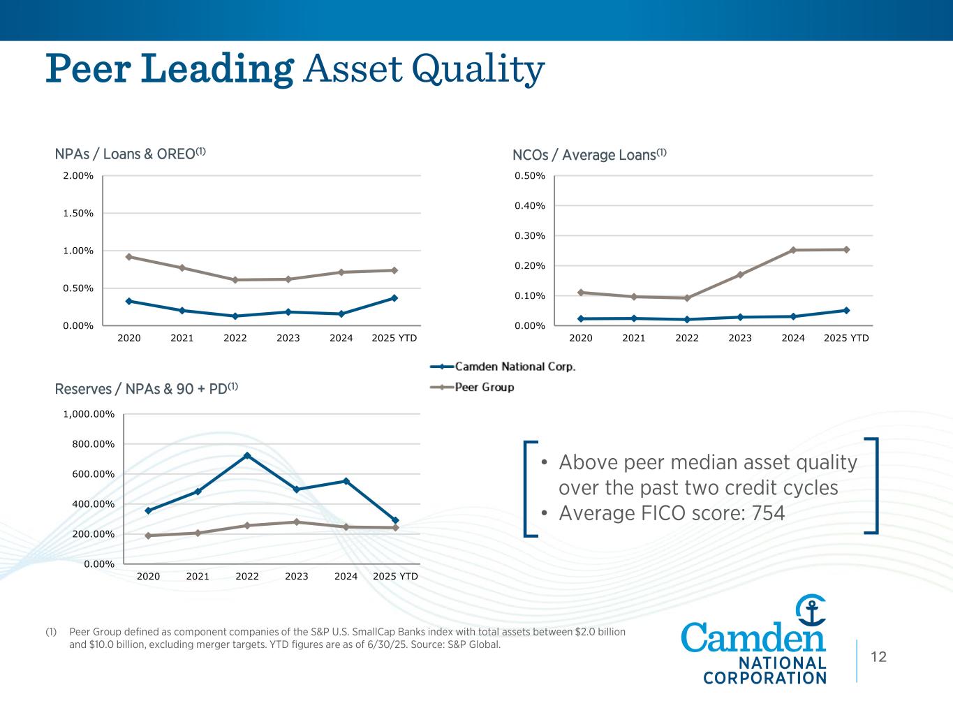 Diversified Low-Cost Deposit Base (1) This is a non-GAAP financial measure. Refer to the non-GAAP reconciliation table in the appendix. • Total deposits up 22%, YoY • Acquired $972mm in total deposits from Northway acquisition • Customers with <$1mm in balances made up 70% of adjusted total deposits(1) • Uninsured and uncollateralized deposits of 15% of total deposits, supported by 2.0x available sources of liquidity Deposit Portfolio Highlights (as of September 30, 2025) Loan to Deposit Ratio 11 50.00% 60.00% 70.00% 80.00% 90.00% 100.00% 2020 2021 2022 2023 2024 2025 YTD ($ in millions) Depos it Category Sep 30, 2025 Sep 30, 2024 % Increase (Decrease) Noninterest checking 1 ,1 62$ 941$ 24% Interest checking 1 ,535 1 ,446 6% Savings and money market 1 ,880 1 ,467 28% Certificates of deposit 701 553 27% Brokered deposits 1 24 1 69 (26%) 5,403$ 4,575$ 1 8% Average Deposit Balances 5,307$ 4,367$ 22% Period Ended 13