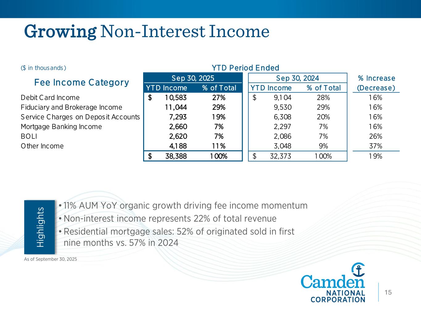 Growing Non-Interest Income H ig hl ig ht s 12 • 11% AUM YoY organic growth driving fee income momentum • Non-interest income represents 22% of total revenue • Residential mortgage sales: 52% of originated sold in first nine months vs. 57% in 2024 As of September 30, 2025 ($ in thousands) YTD Income % of Total YTD Income % of Total Debit Card Income 1 0,583$ 27% 9,1 04$ 28% 1 6% Fiduciary and Brokerage Income 1 1 ,044 29% 9,530 29% 1 6% Service Charges on Deposit Accounts 7,293 1 9% 6,308 20% 1 6% Mortgage Banking Income 2,660 7% 2,297 7% 1 6% BOLI 2,620 7% 2,086 7% 26% Other Income 4,1 88 1 1 % 3,048 9% 37% 38,388$ 1 00% 32,373$ 1 00% 1 9% % Increase (Decrease) Sep 30, 2025 Sep 30, 2024 YTD Period Ended Fee Income Category 15