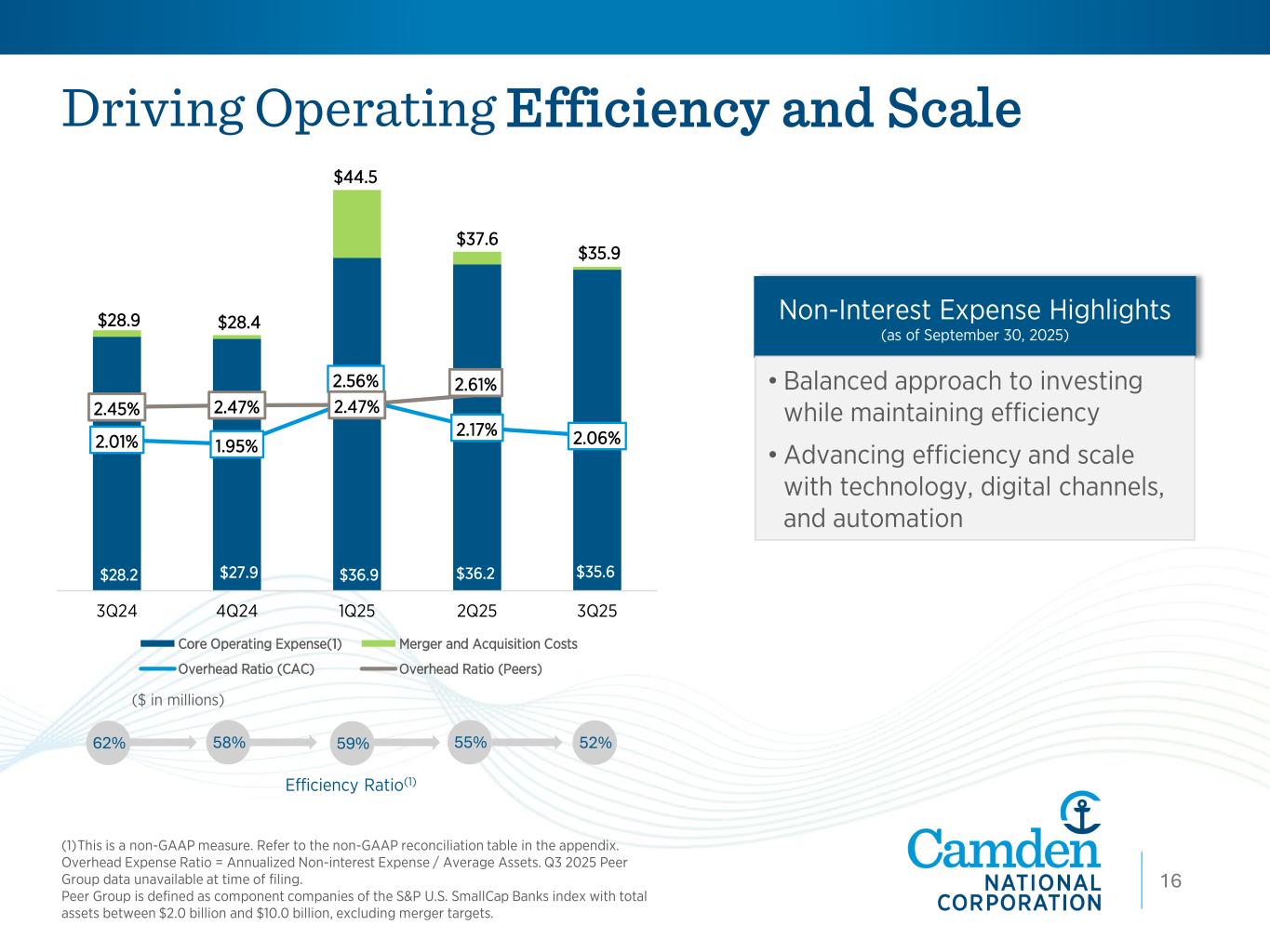 Driving Operating Efficiency and Scale ($ in millions) Efficiency Ratio(1) 62% 58% 59% 55% 52% Non-Interest Expense Highlights (as of September 30, 2025) 13 (1)This is a non-GAAP measure. Refer to the non-GAAP reconciliation table in the appendix. Overhead Expense Ratio = Annualized Non-interest Expense / Average Assets. Q3 2025 Peer Group data unavailable at time of filing. Peer Group is defined as component companies of the S&P U.S. SmallCap Banks index with total assets between $2.0 billion and $10.0 billion, excluding merger targets. • Balanced approach to investing while maintaining efficiency • Advancing efficiency and scale with technology, digital channels, and automation $28.2 $27.9 $36.9 $36.2 $35.6 $28.9 $28.4 $44.5 $37.6 $35.9 2.01% 1.95% 2.56% 2.17% 2.06% 2.45% 2.47% 2.47% 2.61% 0.00% 1.00% 2.00% 3.00% 4.00% 5.00% 6.00% $- $5.0 $10.0 $15.0 $20.0 $25.0 $30.0 $35.0 $40.0 $45.0 $50.0 3Q24 4Q24 1Q25 2Q25 3Q25 Core Operating Expense(1) Merger and Acquisition Costs Overhead Ratio (CAC) Overhead Ratio (Peers) 16