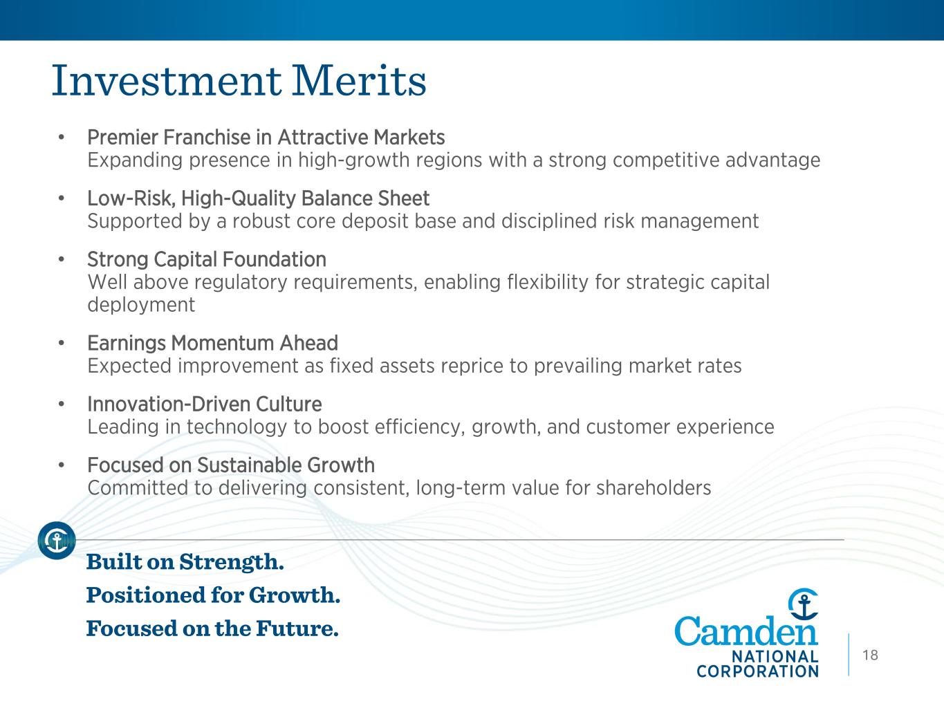 Total Capital Ratio TCE Ratio(1) Leverage Ratio Capital Levels that Support Key Strategic Initiatives (1) This is a non-GAAP financial measure. Refer to the Company’s financial information filed with the SEC for the respective period. 14.85% 15.11% 13.13% 13.35% 13.47% 3Q24 4Q24 1Q25 2Q25 3Q25 9.84% 9.90% 8.58% 8.74% 8.94% 3Q24 4Q24 1Q25 2Q25 3Q25 7.69% 7.64% 6.49% 6.77% 7.09% 3Q24 4Q24 1Q25 2Q25 3Q25 Northway AcquisitionNorthway Acquisition Robust capital and organic growth support resilience across market conditions • Capital rebuilding rapidly post Northway- Acquisition • Strong internal capital generation • Capital levels aligned with internal policy and regulatory capital well above requirements • Annual Dividend Rate: $1.68/share 17