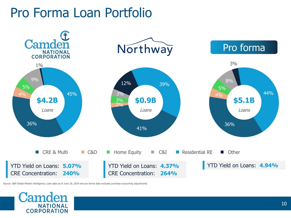 Pro Forma Deposit Portfolio Pro forma 7% 7% 7% 8% 7% 9% $4.5B $1.0B $5.5B 63% 21% 20% Deposits Deposits Deposits 65% 65% 21% Noninterest Bearing IB Demand, Savings & MMDA Retail Time Deposits Jumbo Time Deposits YTD Cost of Deposits: 2.10% YTD Cost of Deposits: 1.14% YTD Cost of Deposits: 1.92% 1 1 1 Deposit Beta : 39.6% Deposit Beta : 21.0% Deposit Beta : 34.2% Loans to Deposits: 92.0% Loans to Deposits: 91.7% Loans to Deposits: 92.0% Source: S&P Global Market Intelligence; Deposit data as of June 30, 2024 and pro forma data excludes purchase accounting adjustments; Jumbo time deposits are defined as time deposits greater than $100 thousand 1) Deposit beta is calculated as the difference between the Q4 2021 and Q2 2024 deposit cost divided by 5.25%, or the change in the federal funds rate between 1/1/2022 and 6/30/2024 9 9 9