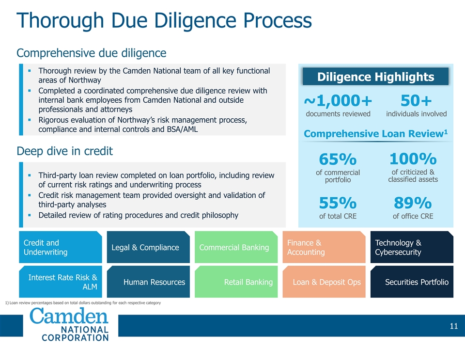 Thorough Due Diligence Process Comprehensive due diligence ▪ Thorough review by the Camden National team of all key functional Diligence Highlights areas of Northway ▪ Completed a coordinated comprehensive due diligence review with internal bank employees from Camden National and outside ~1,000+ 50+ professionals and attorneys documents reviewed individuals involved ▪ Rigorous evaluation of Northway’s risk management process, compliance and internal controls and BSA/AML 1 Comprehensive Loan Review Deep dive in credit 100% 65% of criticized & of commercial ▪ Third-party loan review completed on loan portfolio, including review classified assets portfolio of current risk ratings and underwriting process ▪ Credit risk management team provided oversight and validation of third-party analyses 55% 89% ▪ Detailed review of rating procedures and credit philosophy of total CRE of office CRE Credit and Finance & Technology & Legal & Compliance Commercial Banking Underwriting Accounting Cybersecurity Interest Rate Risk & Human Resources Retail Banking Loan & Deposit Ops Securities Portfolio ALM 1) Loan review percentages based on total dollars outstanding for each respective category 11 11 11 11