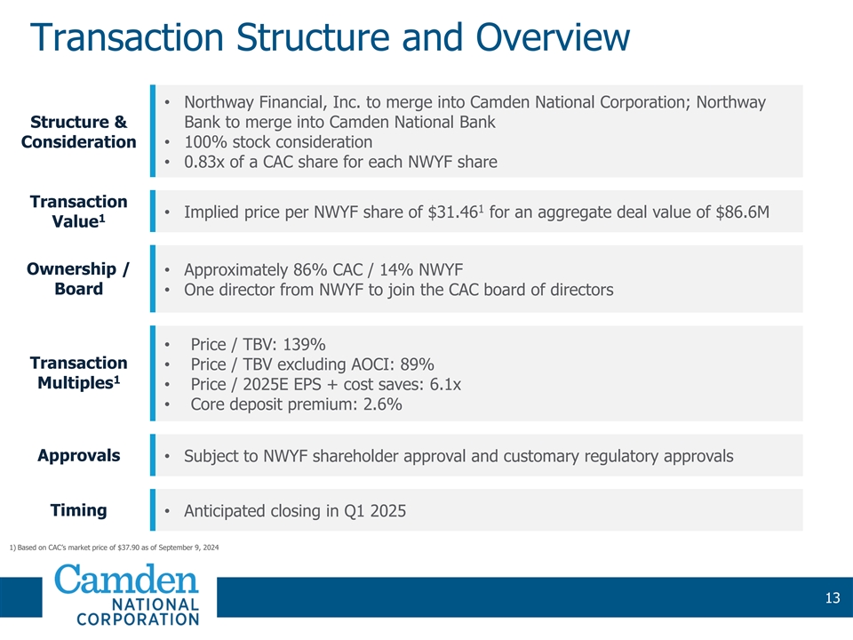 Transaction Structure and Overview • Northway Financial, Inc. to merge into Camden National Corporation; Northway Structure & Bank to merge into Camden National Bank Consideration • 100% stock consideration • 0.83x of a CAC share for each NWYF share Transaction 1 • Implied price per NWYF share of $31.46 for an aggregate deal value of $86.6M 1 Value Ownership / • Approximately 86% CAC / 14% NWYF Board • One director from NWYF to join the CAC board of directors • Price / TBV: 139% Transaction • Price / TBV excluding AOCI: 89% 1 Multiples • Price / 2025E EPS + cost saves: 6.1x • Core deposit premium: 2.6% Approvals • Subject to NWYF shareholder approval and customary regulatory approvals Timing • Anticipated closing in Q1 2025 1) Based on CAC’s market price of $37.90 as of September 9, 2024 13 13 13