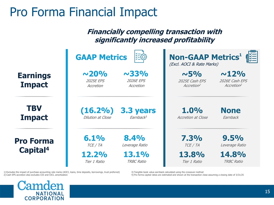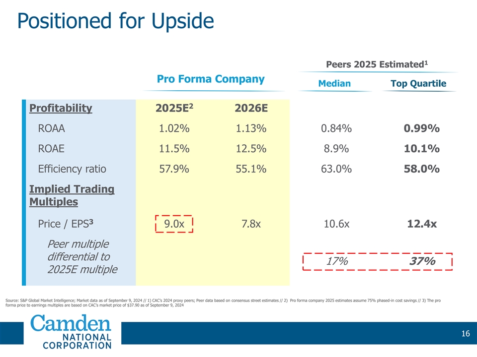 Pro Forma Financial Impact Financially compelling transaction with significantly increased profitability 1 GAAP Metrics Non-GAAP Metrics (Excl. AOCI & Rate Marks) ~33% ~20% ~5% ~12% Earnings 2026E EPS 2025E EPS 2025E Cash EPS 2026E Cash EPS 2 2 Accretion Accretion Accretion Impact Accretion TBV (16.2%) 3.3 years 1.0% None 3 Dilution at Close Earnback Accretion at Close Earnback Impact 6.1% 8.4% 7.3% 9.5% Pro Forma TCE / TA Leverage Ratio TCE / TA Leverage Ratio 4 Capital 12.2% 13.1% 13.8% 14.8% Tier 1 Ratio TRBC Ratio Tier 1 Ratio TRBC Ratio 1) Excludes the impact of purchase accounting rate marks (AOCI, loans, time deposits, borrowings, trust preferred) 3) Tangible book value earnback calculated using the crossover method 2) Cash EPS accretion also excludes CDI and CECL amortization 4) Pro forma capital ratios are estimated and shown at the transaction close assuming a closing date of 3/31/25 15 15 15 15