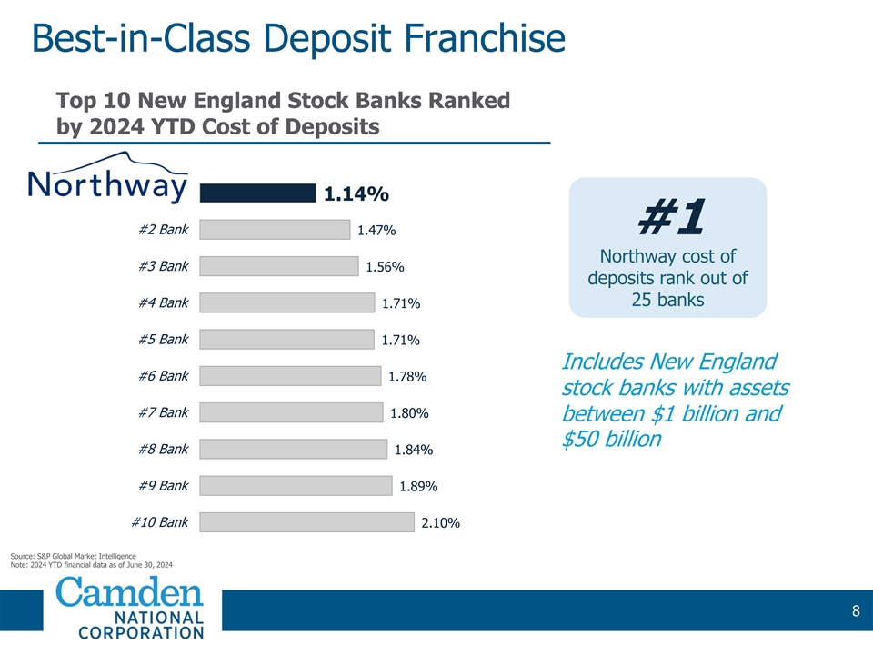 Positioned for Growth in Attractive Markets Select New Hampshire Counties New Maine Hampshire Hillsborough Population 1,394K 1,406K Population: 423K Median HHI: $98.0K Berlin GDP: $35B Projected ’24-’29 growth Population Population: 2.8% 45/sq. mi 157/sq. mi density HHI: 9.0% Rockingham Laconia Household $71.5K $94.9K Population: 322K Claremont Income Median HHI: $112.5K Concord GDP: $28B Portsmouth Projected ’24-’29 growth Keene Population: 3.3% GDP $94B $115B Manchester HHI: 9.1% Nashua Major Employers # of 74,836 91,452 Businesses Source: S&P Global Market Intelligence, US Bureau of Economic Analysis, NAICS Association // Household income (“HHI”) shown on a median basis 7 7 7 7