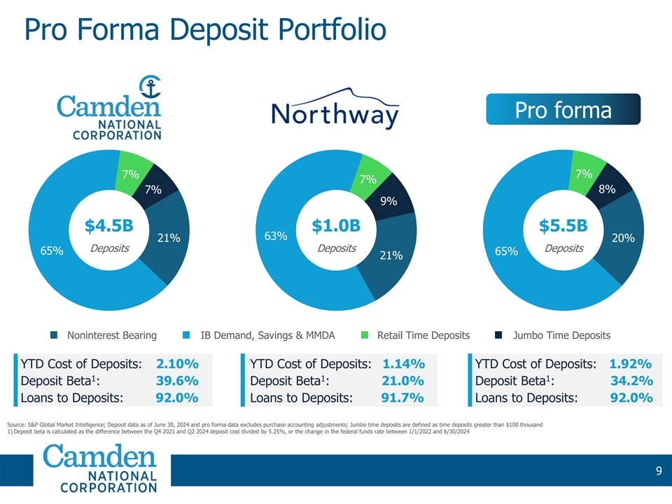 Best-in-Class Deposit Franchise Top 10 New England Stock Banks Ranked by 2024 YTD Cost of Deposits 1.14% #2 Bank 1.47% #1 Northway cost of #3 Bank 1.56% deposits rank out of 25 banks #4 Bank 1.71% #5 Bank 1.71% Includes New England #6 Bank 1.78% stock banks with assets #7 Bank 1.80% between $1 billion and $50 billion #8 Bank 1.84% #9 Bank 1.89% #10 Bank 2.10% Source: S&P Global Market Intelligence Note: 2024 YTD financial data as of June 30, 2024 8 8 8
