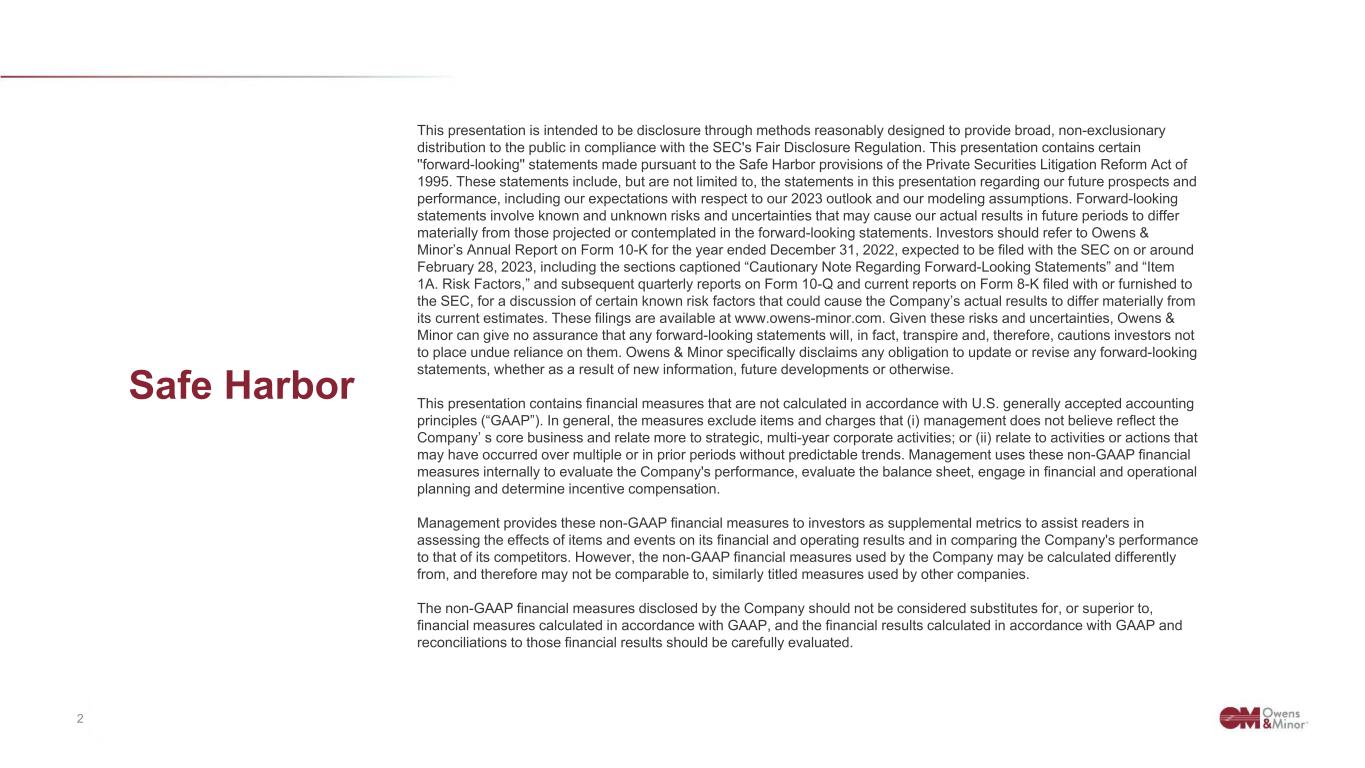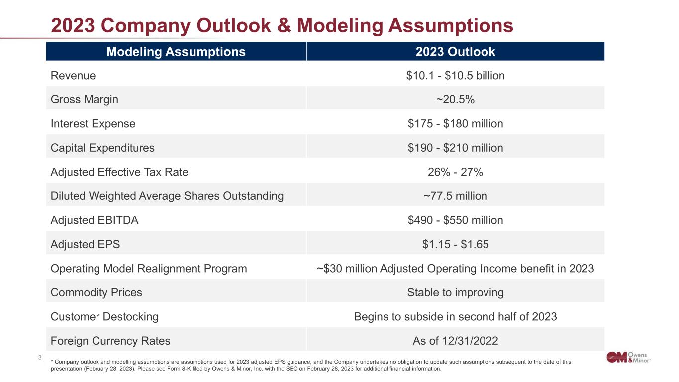 2 Confidential & Proprietary to Owens & Minor, Inc. Safe Harbor This presentation is intended to be disclosure through methods reasonably designed to provide broad, non-exclusionary distribution to the public in compliance with the SEC's Fair Disclosure Regulation. This presentation contains certain ''forward-looking'' statements made pursuant to the Safe Harbor provisions of the Private Securities Litigation Reform Act of 1995. These statements include, but are not limited to, the statements in this presentation regarding our future prospects and performance, including our expectations with respect to our 2023 outlook and our modeling assumptions. Forward-looking statements involve known and unknown risks and uncertainties that may cause our actual results in future periods to differ materially from those projected or contemplated in the forward-looking statements. Investors should refer to Owens & Minor’s Annual Report on Form 10-K for the year ended December 31, 2022, expected to be filed with the SEC on or around February 28, 2023, including the sections captioned “Cautionary Note Regarding Forward-Looking Statements” and “Item 1A. Risk Factors,” and subsequent quarterly reports on Form 10-Q and current reports on Form 8-K filed with or furnished to the SEC, for a discussion of certain known risk factors that could cause the Company’s actual results to differ materially from its current estimates. These filings are available at www.owens-minor.com. Given these risks and uncertainties, Owens & Minor can give no assurance that any forward-looking statements will, in fact, transpire and, therefore, cautions investors not to place undue reliance on them. Owens & Minor specifically disclaims any obligation to update or revise any forward-looking statements, whether as a result of new information, future developments or otherwise. This presentation contains financial measures that are not calculated in accordance with U.S. generally accepted accounting principles (“GAAP”). In general, the measures exclude items and charges that (i) management does not believe reflect the Company’ s core business and relate more to strategic, multi-year corporate activities; or (ii) relate to activities or actions that may have occurred over multiple or in prior periods without predictable trends. Management uses these non-GAAP financial measures internally to evaluate the Company's performance, evaluate the balance sheet, engage in financial and operational planning and determine incentive compensation. Management provides these non-GAAP financial measures to investors as supplemental metrics to assist readers in assessing the effects of items and events on its financial and operating results and in comparing the Company's performance to that of its competitors. However, the non-GAAP financial measures used by the Company may be calculated differently from, and therefore may not be comparable to, similarly titled measures used by other companies. The non-GAAP financial measures disclosed by the Company should not be considered substitutes for, or superior to, financial measures calculated in accordance with GAAP, and the financial results calculated in accordance with GAAP and reconciliations to those financial results should be carefully evaluated.