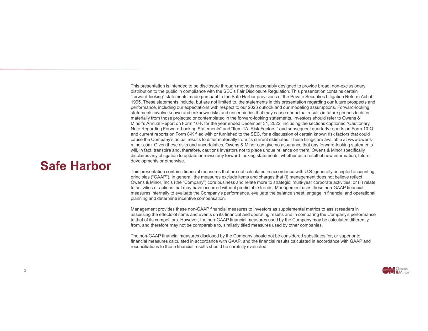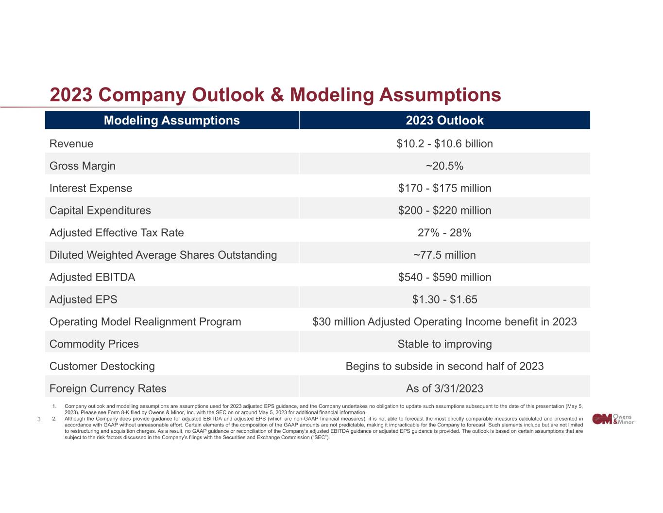 2 Confidential & Proprietary to Owens & Minor, Inc. Safe Harbor This presentation is intended to be disclosure through methods reasonably designed to provide broad, non-exclusionary distribution to the public in compliance with the SEC's Fair Disclosure Regulation. This presentation contains certain ''forward-looking'' statements made pursuant to the Safe Harbor provisions of the Private Securities Litigation Reform Act of 1995. These statements include, but are not limited to, the statements in this presentation regarding our future prospects and performance, including our expectations with respect to our 2023 outlook and our modeling assumptions. Forward-looking statements involve known and unknown risks and uncertainties that may cause our actual results in future periods to differ materially from those projected or contemplated in the forward-looking statements. Investors should refer to Owens & Minor’s Annual Report on Form 10-K for the year ended December 31, 2022, including the sections captioned “Cautionary Note Regarding Forward-Looking Statements” and “Item 1A. Risk Factors,” and subsequent quarterly reports on Form 10-Q and current reports on Form 8-K filed with or furnished to the SEC, for a discussion of certain known risk factors that could cause the Company’s actual results to differ materially from its current estimates. These filings are available at www.owens- minor.com. Given these risks and uncertainties, Owens & Minor can give no assurance that any forward-looking statements will, in fact, transpire and, therefore, cautions investors not to place undue reliance on them. Owens & Minor specifically disclaims any obligation to update or revise any forward-looking statements, whether as a result of new information, future developments or otherwise. This presentation contains financial measures that are not calculated in accordance with U.S. generally accepted accounting principles (“GAAP”). In general, the measures exclude items and charges that (i) management does not believe reflect Owens & Minor, Inc’s (the “Company”) core business and relate more to strategic, multi-year corporate activities; or (ii) relate to activities or actions that may have occurred without predictable trends. Management uses these non-GAAP financial measures internally to evaluate the Company's performance, evaluate the balance sheet, engage in financial and operational planning and determine incentive compensation. Management provides these non-GAAP financial measures to investors as supplemental metrics to assist readers in assessing the effects of items and events on its financial and operating results and in comparing the Company's performance to that of its competitors. However, the non-GAAP financial measures used by the Company may be calculated differently from, and therefore may not be comparable to, similarly titled measures used by other companies. The non-GAAP financial measures disclosed by the Company should not be considered substitutes for, or superior to, financial measures calculated in accordance with GAAP, and the financial results calculated in accordance with GAAP and reconciliations to those financial results should be carefully evaluated.