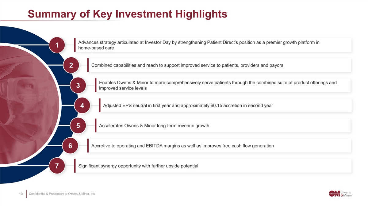 Summary of Key Investment Highlights Advances strategy articulated at Investor Day by strengthening Patient Direct’s position as a premier growth platform in 1 home-based care Combined capabilities and reach to support improved service to patients, providers and payors 2 Enables Owens & Minor to more comprehensively serve patients through the combined suite of product offerings and 3 improved service levels Adjusted EPS neutral in first year and approximately $0.15 accretion in second year 4 Accelerates Owens & Minor long-term revenue growth 5 Accretive to operating and EBITDA margins as well as improves free cash flow generation 6 Significant synergy opportunity with further upside potential 7 10 10
