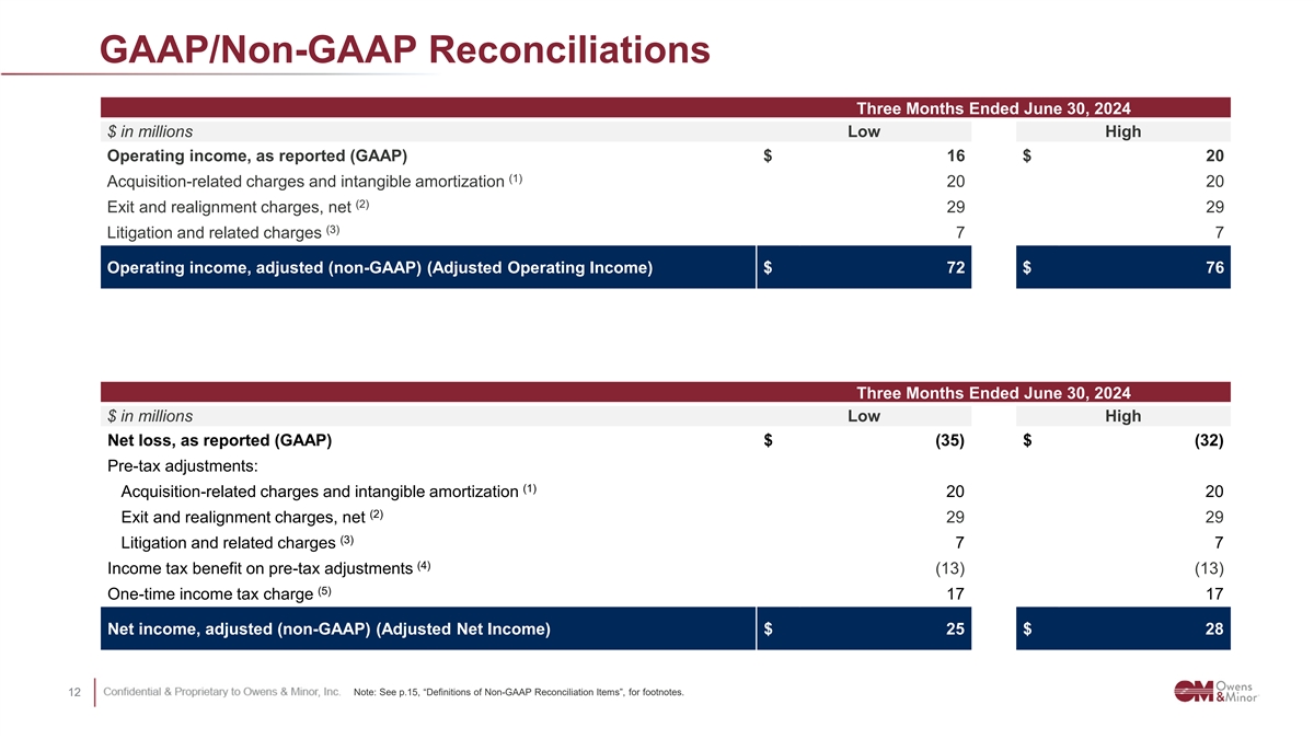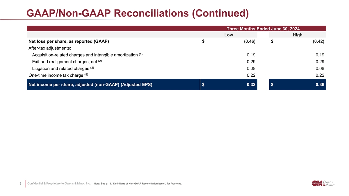 GAAP/Non-GAAP Reconciliations Three Months Ended June 30, 2024 $ in millions Low High Operating income, as reported (GAAP) $ 16 $ 20 (1) Acquisition-related charges and intangible amortization 20 20 (2) Exit and realignment charges, net 29 29 (3) Litigation and related charges 7 7 Operating income, adjusted (non-GAAP) (Adjusted Operating Income) $ 72 $ 76 Three Months Ended June 30, 2024 $ in millions Low High Net loss, as reported (GAAP) $ (35) $ (32) Pre-tax adjustments: (1) Acquisition-related charges and intangible amortization 20 20 (2) Exit and realignment charges, net 29 29 (3) Litigation and related charges 7 7 (4) Income tax benefit on pre-tax adjustments (13) (13) (5) One-time income tax charge 17 17 Net income, adjusted (non-GAAP) (Adjusted Net Income) $ 25 $ 28 Note: See p.15, “Definitions of Non-GAAP Reconciliation Items”, for footnotes. 12 12