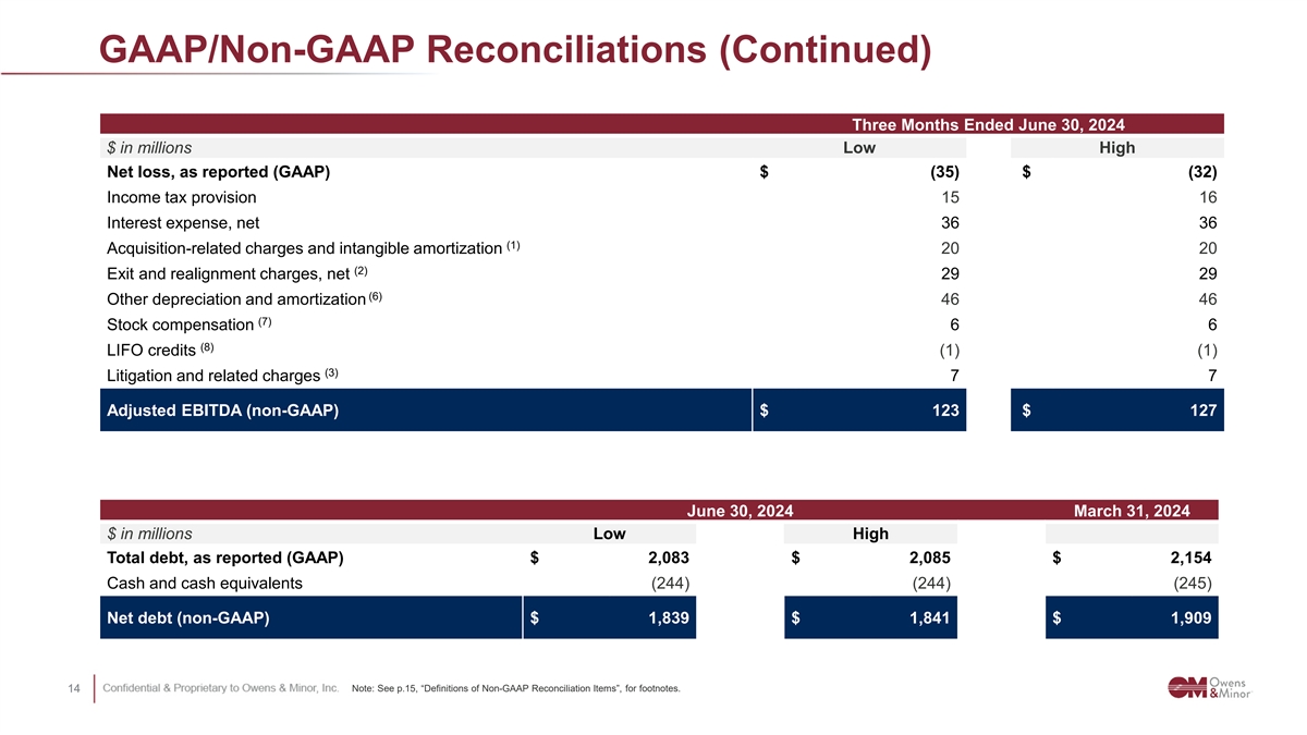 GAAP/Non-GAAP Reconciliations (Continued) Three Months Ended June 30, 2024 Low High Net loss per share, as reported (GAAP) $ (0.46) $ (0.42) After-tax adjustments: (1) Acquisition-related charges and intangible amortization 0.19 0.19 (2) Exit and realignment charges, net 0.29 0.29 (3) Litigation and related charges 0.08 0.08 (5) One-time income tax charge 0.22 0.22 Net income per share, adjusted (non-GAAP) (Adjusted EPS) $ 0.32 $ 0.36 Note: See p.15, “Definitions of Non-GAAP Reconciliation Items”, for footnotes. 13 13