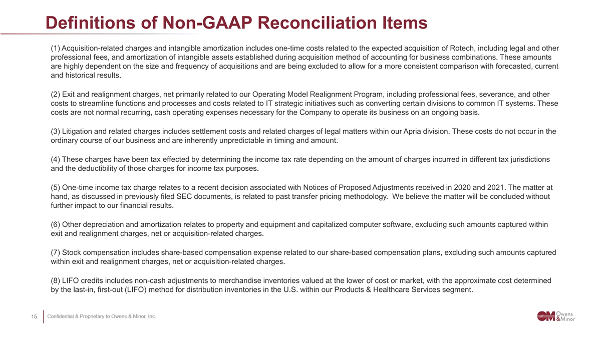 Definitions of Non-GAAP Reconciliation Items (1) Acquisition-related charges and intangible amortization includes one-time costs related to the expected acquisition of Rotech, including legal and other professional fees, and amortization of intangible assets established during acquisition method of accounting for business combinations. These amounts are highly dependent on the size and frequency of acquisitions and are being excluded to allow for a more consistent comparison with forecasted, current and historical results. (2) Exit and realignment charges, net primarily related to our Operating Model Realignment Program, including professional fees, severance, and other costs to streamline functions and processes and costs related to IT strategic initiatives such as converting certain divisions to common IT systems. These costs are not normal recurring, cash operating expenses necessary for the Company to operate its business on an ongoing basis. (3) Litigation and related charges includes settlement costs and related charges of legal matters within our Apria division. These costs do not occur in the ordinary course of our business and are inherently unpredictable in timing and amount. (4) These charges have been tax effected by determining the income tax rate depending on the amount of charges incurred in different tax jurisdictions and the deductibility of those charges for income tax purposes. (5) One-time income tax charge relates to a recent decision associated with Notices of Proposed Adjustments received in 2020 and 2021. The matter at hand, as discussed in previously filed SEC documents, is related to past transfer pricing methodology. We believe the matter will be concluded without further impact to our financial results. (6) Other depreciation and amortization relates to property and equipment and capitalized computer software, excluding such amounts captured within exit and realignment charges, net or acquisition-related charges. (7) Stock compensation includes share-based compensation expense related to our share-based compensation plans, excluding such amounts captured within exit and realignment charges, net or acquisition-related charges. (8) LIFO credits includes non-cash adjustments to merchandise inventories valued at the lower of cost or market, with the approximate cost determined by the last-in, first-out (LIFO) method for distribution inventories in the U.S. within our Products & Healthcare Services segment. 15 15