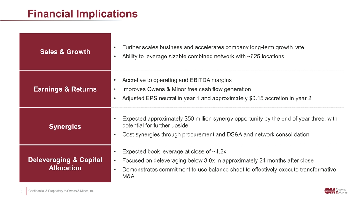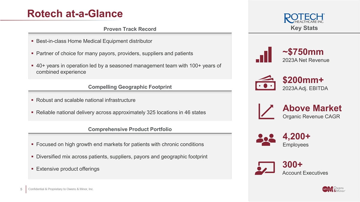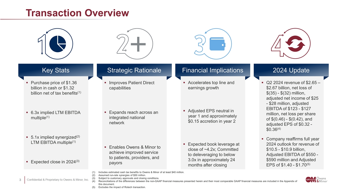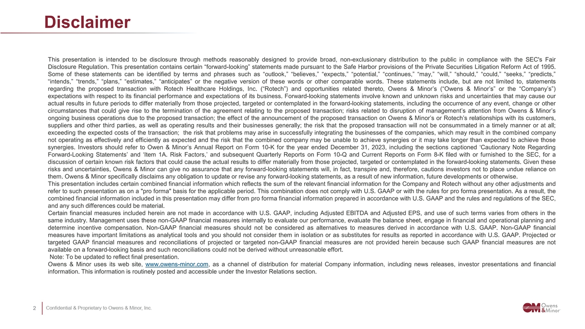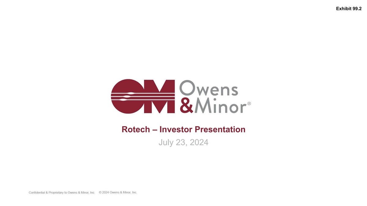 Disclaimer This presentation is intended to be disclosure through methods reasonably designed to provide broad, non-exclusionary distribution to the public in compliance with the SEC's Fair Disclosure Regulation. This presentation contains certain “forward-looking” statements made pursuant to the Safe Harbor provisions of the Private Securities Litigation Reform Act of 1995. Some of these statements can be identified by terms and phrases such as “outlook,” “believes,” “expects,” “potential,” “continues,” “may,” “will,” “should,” “could,” “seeks,” “predicts,” “intends,” “trends,” “plans,” “estimates,” “anticipates” or the negative version of these words or other comparable words. These statements include, but are not limited to, statements regarding the proposed transaction with Rotech Healthcare Holdings, Inc. (“Rotech”) and opportunities related thereto, Owens & Minor’s (“Owens & Minor’s” or the “Company’s”) expectations with respect to its financial performance and expectations of its business. Forward-looking statements involve known and unknown risks and uncertainties that may cause our actual results in future periods to differ materially from those projected, targeted or contemplated in the forward-looking statements, including the occurrence of any event, change or other circumstances that could give rise to the termination of the agreement relating to the proposed transaction; risks related to disruption of management’s attention from Owens & Minor’s ongoing business operations due to the proposed transaction; the effect of the announcement of the proposed transaction on Owens & Minor’s or Rotech’s relationships with its customers, suppliers and other third parties, as well as operating results and their businesses generally; the risk that the proposed transaction will not be consummated in a timely manner or at all; exceeding the expected costs of the transaction; the risk that problems may arise in successfully integrating the businesses of the companies, which may result in the combined company not operating as effectively and efficiently as expected and the risk that the combined company may be unable to achieve synergies or it may take longer than expected to achieve those synergies. Investors should refer to Owen & Minor’s Annual Report on Form 10-K for the year ended December 31, 2023, including the sections captioned ‘Cautionary Note Regarding Forward-Looking Statements’ and ‘Item 1A. Risk Factors,’ and subsequent Quarterly Reports on Form 10-Q and Current Reports on Form 8-K filed with or furnished to the SEC, for a discussion of certain known risk factors that could cause the actual results to differ materially from those projected, targeted or contemplated in the forward-looking statements. Given these risks and uncertainties, Owens & Minor can give no assurance that any forward-looking statements will, in fact, transpire and, therefore, cautions investors not to place undue reliance on them. Owens & Minor specifically disclaims any obligation to update or revise any forward-looking statements, as a result of new information, future developments or otherwise. This presentation includes certain combined financial information which reflects the sum of the relevant financial information for the Company and Rotech without any other adjustments and refer to such presentation as on a pro forma basis for the applicable period. This combination does not comply with U.S. GAAP or with the rules for pro forma presentation. As a result, the combined financial information included in this presentation may differ from pro forma financial information prepared in accordance with U.S. GAAP and the rules and regulations of the SEC, and any such differences could be material. Certain financial measures included herein are not made in accordance with U.S. GAAP, including Adjusted EBITDA and Adjusted EPS, and use of such terms varies from others in the same industry. Management uses these non-GAAP financial measures internally to evaluate our performance, evaluate the balance sheet, engage in financial and operational planning and determine incentive compensation. Non-GAAP financial measures should not be considered as alternatives to measures derived in accordance with U.S. GAAP. Non-GAAP financial measures have important limitations as analytical tools and you should not consider them in isolation or as substitutes for results as reported in accordance with U.S. GAAP. Projected or targeted GAAP financial measures and reconciliations of projected or targeted non-GAAP financial measures are not provided herein because such GAAP financial measures are not available on a forward-looking basis and such reconciliations could not be derived without unreasonable effort. Note: To be updated to reflect final presentation. Owens & Minor uses its web site, www.owens-minor.com, as a channel of distribution for material Company information, including news releases, investor presentations and financial information. This information is routinely posted and accessible under the Investor Relations section. 2 2