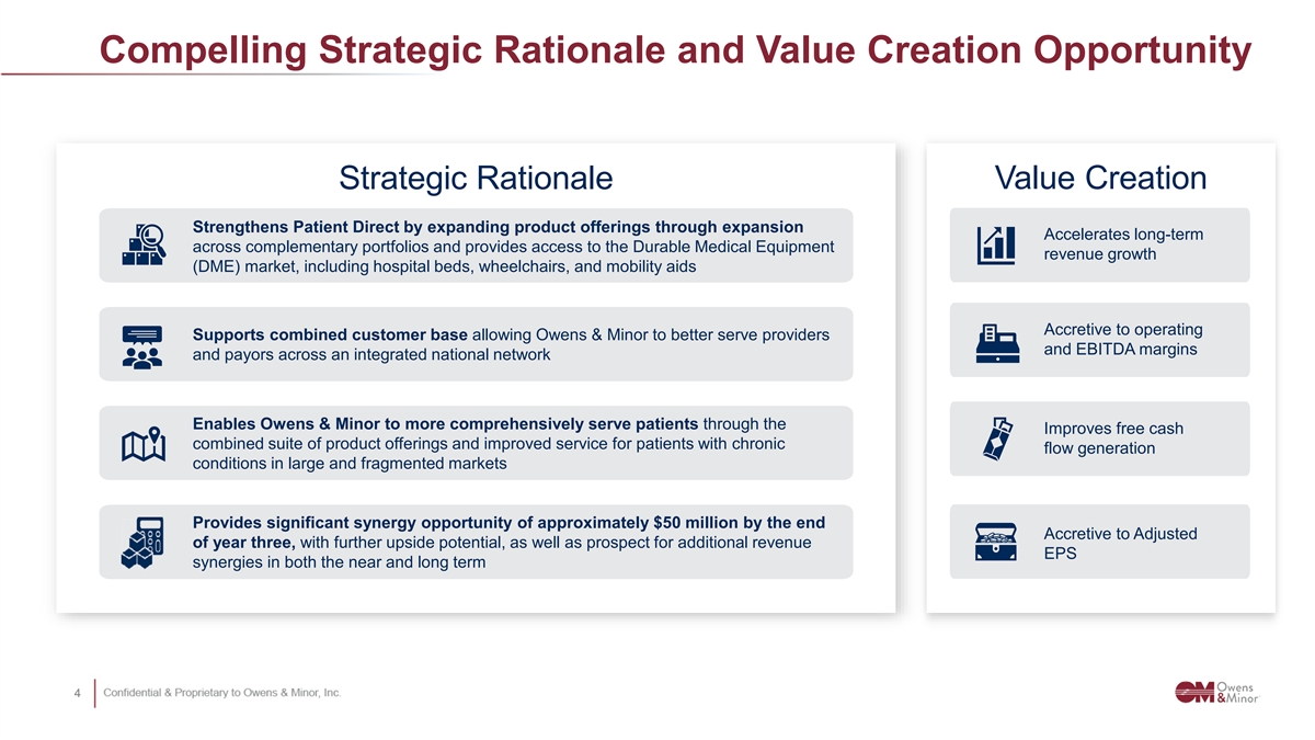 Transaction Overview Key Stats Strategic Rationale Financial Implications 2024 Update § Purchase price of $1.36 § Improves Patient Direct § Accelerates top line and § Q2 2024 revenue of $2.65 – earnings growth $2.67 billion, net loss of billion in cash or $1.32 capabilities (1) billion net of tax benefits $(35) - $(32) million, adjusted net income of $25 - $28 million, adjusted EBITDA of $123 - $127 § Adjusted EPS neutral in § Expands reach across an § 6.3x implied LTM EBITDA million, net loss per share year 1 and approximately (1) multiple integrated national of $(0.46) - $(0.42), and $0.15 accretion in year 2 network adjusted EPS of $0.32 - (4) $0.36 (2) § 5.1x implied synergized § Company reaffirms full year (1) LTM EBITDA multiple § Expected book leverage at 2024 outlook for revenue of § Enables Owens & Minor to close of ~4.2x; Committed $10.5 - $10.9 billion, achieve improved service to deleveraging to below Adjusted EBITDA of $550 - to patients, providers, and 3.0x in approximately 24 $590 million and Adjusted (3) § Expected close in 2024 payors (5) months after closing EPS of $1.40 - $1.70 (1) Includes estimated cash tax benefits to Owens & Minor of at least $40 million. (2) Assumed run-rate synergies of $50 million. (3) Subject to customary approvals and closing conditions. 3 3 (4) Reconciliations of the differences between the non-GAAP financial measures presented herein and their most comparable GAAP financial measures are included in the Appendix of this document. (5) Excludes the impact of Rotech transaction. 2