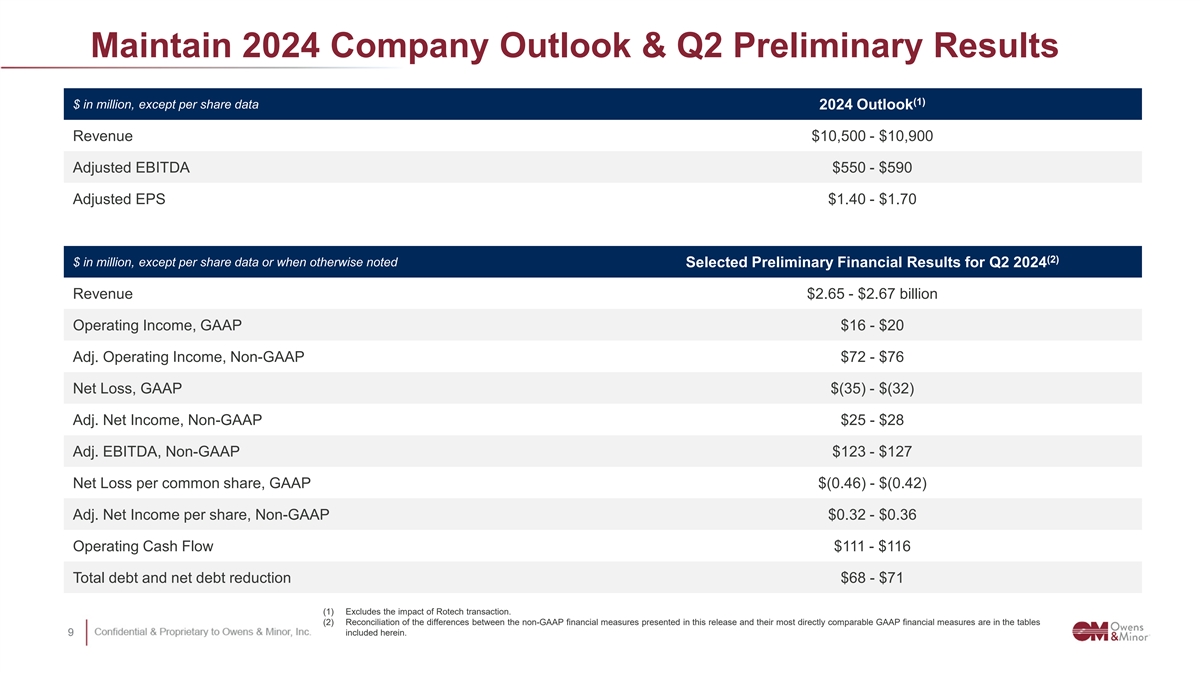 Financial Implications • Further scales business and accelerates company long-term growth rate Sales & Growth • Ability to leverage sizable combined network with ~625 locations • Accretive to operating and EBITDA margins • Improves Owens & Minor free cash flow generation Earnings & Returns • Adjusted EPS neutral in year 1 and approximately $0.15 accretion in year 2 • Expected approximately $50 million synergy opportunity by the end of year three, with potential for further upside Synergies • Cost synergies through procurement and DS&A and network consolidation • Expected book leverage at close of ~4.2x Deleveraging & Capital • Focused on deleveraging below 3.0x in approximately 24 months after close Allocation • Demonstrates commitment to use balance sheet to effectively execute transformative M&A 8 8