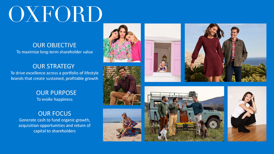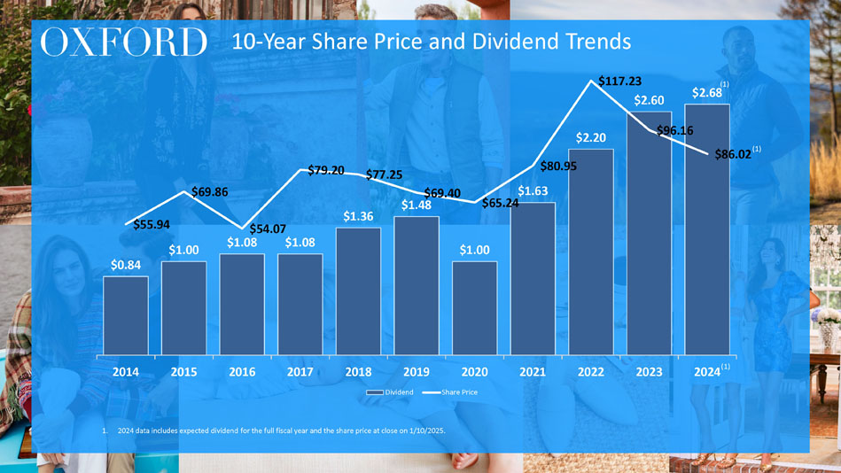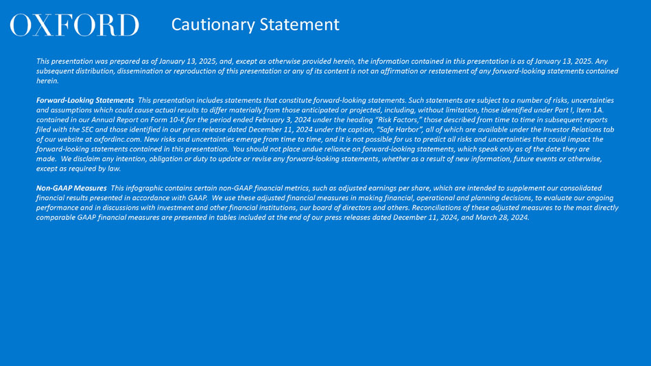 This presentation was prepared as of January 13, 2025, and, except as otherwise provided herein, the information contained in th is presentation is as of January 13, 202 5 . Any subsequent distribution, dissemination or reproduction of this presentation or any of its content is not an affirmation or re sta tement of any forward - looking statements contained herein. Forward - Looking Statements This presentation includes statements that constitute forward - looking statements. Such statements are subject to a number of ris ks, uncertainties and assumptions which could cause actual results to differ materially from those anticipated or projected, including, without li mitation, those identified under Part I, Item 1A. contained in our Annual Report on Form 10 - K for the period ended February 3, 2024 under the heading “Risk Factors,” those descri bed from time to time in subsequent reports filed with the SEC and those identified in our press release dated December 11, 2024 under the caption, “Safe Harbor”, all of wh ich are available under the Investor Relations tab of our website at oxfordinc.com. New risks and uncertainties emerge from time to time, and it is not possible for us to predict all risks and uncertainties that could impact the forward - looking statements contained in this presentation. You should not place undue reliance on forward - looking statements, w hich speak only as of the date they are made. We disclaim any intention, obligation or duty to update or revise any forward - looking statements, whether as a result of new information, future events or otherwise, except as required by law. Non - GAAP Measures This infographic contains certain non - GAAP financial metrics, such as adjusted earnings per share, which are intended to supple ment our consolidated financial results presented in accordance with GAAP. We use these adjusted financial measures in making financial, operation al and planning decisions, to evaluate our ongoing performance and in discussions with investment and other financial institutions, our board of directors and others. Reconcili ati ons of these adjusted measures to the most directly comparable GAAP financial measures are presented in tables included at the end of our press releases dated December 11 , 2024, and March 28, 2024 . Cautionary Statement